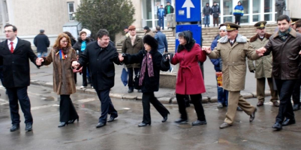 După defilarea gărzii de onoare a Garnizoanei, toţi cei prezenţi - politicieni sau simpli cetăţeni - au fost invitaţi să se prindă în hora unirii şi puţini au fost cei care nu au răspuns acestei invitaţii.