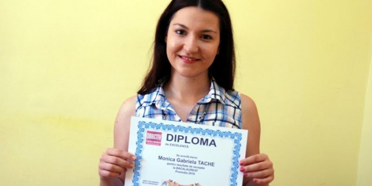 Monica-Gabriela Tache se poate mândri cu două performanţe extraordinare. Pe lângă cea mai mare notă la BAC, ea a avut în 2012 media de admitere la liceu 10.00, obţinând nota maximă la Evaluarea Naţională şi media din gimnaziu. La fel ca acum patru ani, Monica a primit un premiu special din partea cotidianului "Obiectiv - Vocea Brăilei" pentru rezultatele excelente. Îi dorim acestei tinere deosebite un viitor strălucit şi mult succes în viaţă!