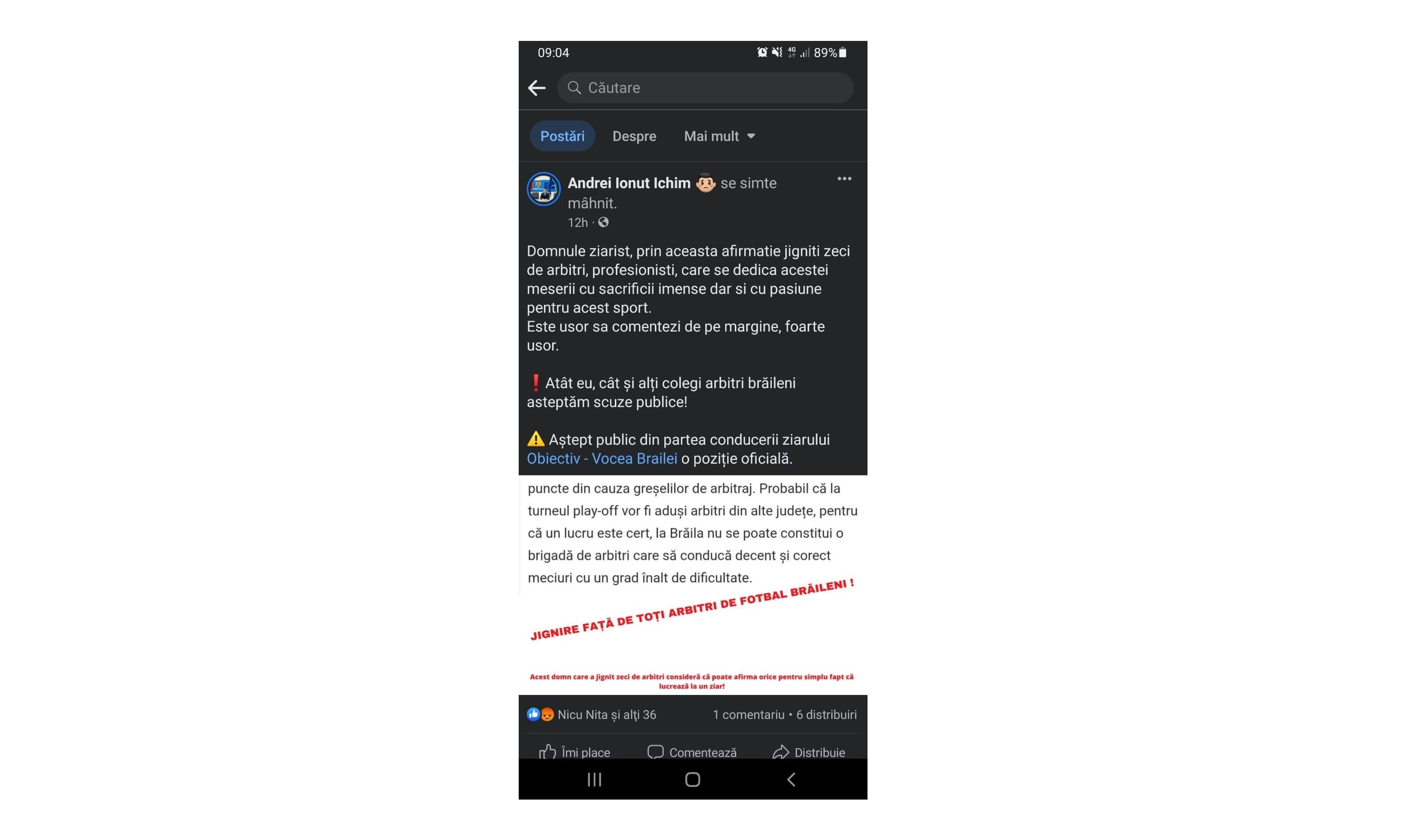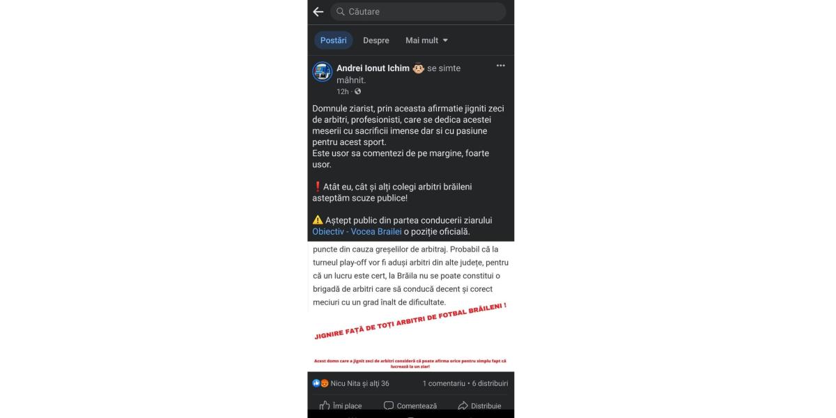 Fraților, noi ăștia de la Scormonitoru recunoaștem: suntem invidioși pe colegii de la ”Obiectiv”. De ce? Păi, când am reușit noi vreodată să facem un consilier județean care n-a scos o vorbuliță, dar măcar o vorbuliță, în vreo ședință de CJ, să facă ditai scandalul pe pagina lui de Facebook. Motivul acțiunii și reacțiunii domnului Andrei Ionuț Ichim, căci despre el este vorba în propoziție, este afirmația colegului nostru de la rubrica SPORT cu privire la modul cum se arbitrează meciurile de mâna a doua la noi la Brăila, după ce un arbitru ar fi făcut-o lată în meciul Sportul Chiscani – Viitorul Cireșu. Cică n-a acordat niște penalty-uri evidente, motiv pentru care ar fi fost suspendat câteva etape. Mai concret, supărarea consilierului județean, care așteaptă scuze publice, este opinia colegului nostru conform căreia în turneul play- off ar fi nevoie la Brăila de niște arbitri din alte județe, ca să fie competițiile corecte. Am uitat să vă spunem că domnul consilier județean este – ați ghicit – arbitru dă Brăila! Acuma, sincer, domnul consilier județean îi interzice dreptul la opinie unui ziarist care a albit scriind de fotbal și văzând pe viu meciuri? Mai mult, arbitrul Ichim vrea scuze publice și o poziție oficială de la conducerea ziarului ”Obiectiv” doar pentru atâta lucru, când mai degrabă în calitate și de consilier județean, ditai PSD, ar fi putut să se delimiteze de astfel de arbitraje controversate? Jenant, având în vedere indemnizațiile alea încasate degeaba de la CJ, din banii noștri ai tuturor, după părerea noastră, a ăstora de la Scormonitoru. Oooops! Ne cerem scuze publice ! (Poziția 69)