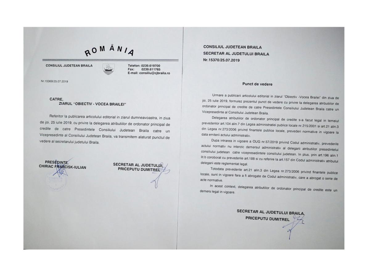 Faptul că preşedintele Consiliului Judeţean Brăila Francisk Chiriac a dat dispoziţii, în mod repetat, din 2016 până în prezent, privind delegarea calităţii de ordonator principal de credite către vicepreşedintele Ionel Epureanu nu încalcă legea cu nimic. Este răspunsul primit de redactorii “Obiectiv - Vocea Brăilei” în urma unei solicitări scrise către Prefectul Judeţului, George Paladi, dar şi din partea secretarului judeţului Dumitrel Priceputu, ca urmare a editorialului “Destul cu cozonacii din CJ”, semnat de Monica Paraschiv şi publicat în ediţia din 25 iulie 2019. Trebuie precizat că discuţiile despre legalitatea sau nelegalitatea dispoziţiei preşedintelui CJ de a delega ordonanţarea de credite către unul dintre cei doi vice, au apărut în cadrul celei mai noi şedinţe ordinare a instituţiei, când consilierul judeţean PND Cătălin Iordache l-a avertizat în mod repetat (de 18 ori) pe Chiriac că încalcă legea prin această delegare, rugându-l respectuos să reanalizeze situaţia. Asta în contextul în care a intrat în vigoare Codul Administrativ (OUG 57) aprobat recent de Guvernul Viorica Dăncilă care schimbă oarecum regulile administraţiei publice locale.