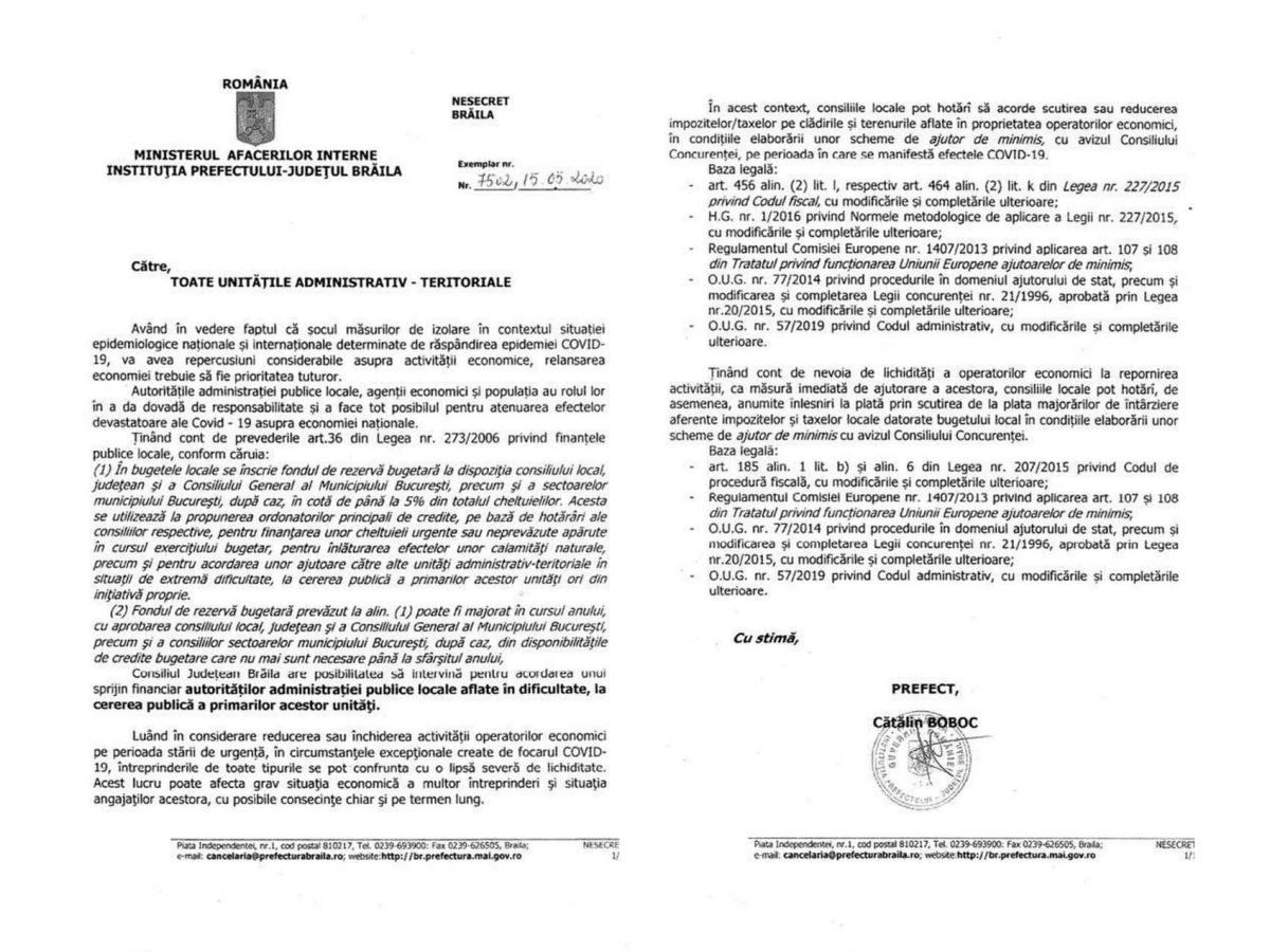 Potrivit prefectului, măsurile pot viza scutirea sau reducerea impozitelor și taxelor locale pe clădirile și terenurile aflate în proprietatea firmelor, precum și scutiri de plată a majorărilor de întârziere ale acestora, toate acestea în condițiile elaborării unor scheme de “ajutor de minimis”, cu notificarea Consiliului Concurenței. De asemenea, Boboc a anunțat că a comunicat UAT-urilor baza legală pe care Consiliul Județean Brăila o are la dispoziție în vederea acordării de sprijin financiar autorităților administrației publice locale aflate în dificultate, ca urmare a cheltuielilor neprevăzute ocazionate de criza COVID-19, la cererea publică a primarilor acestor unități.