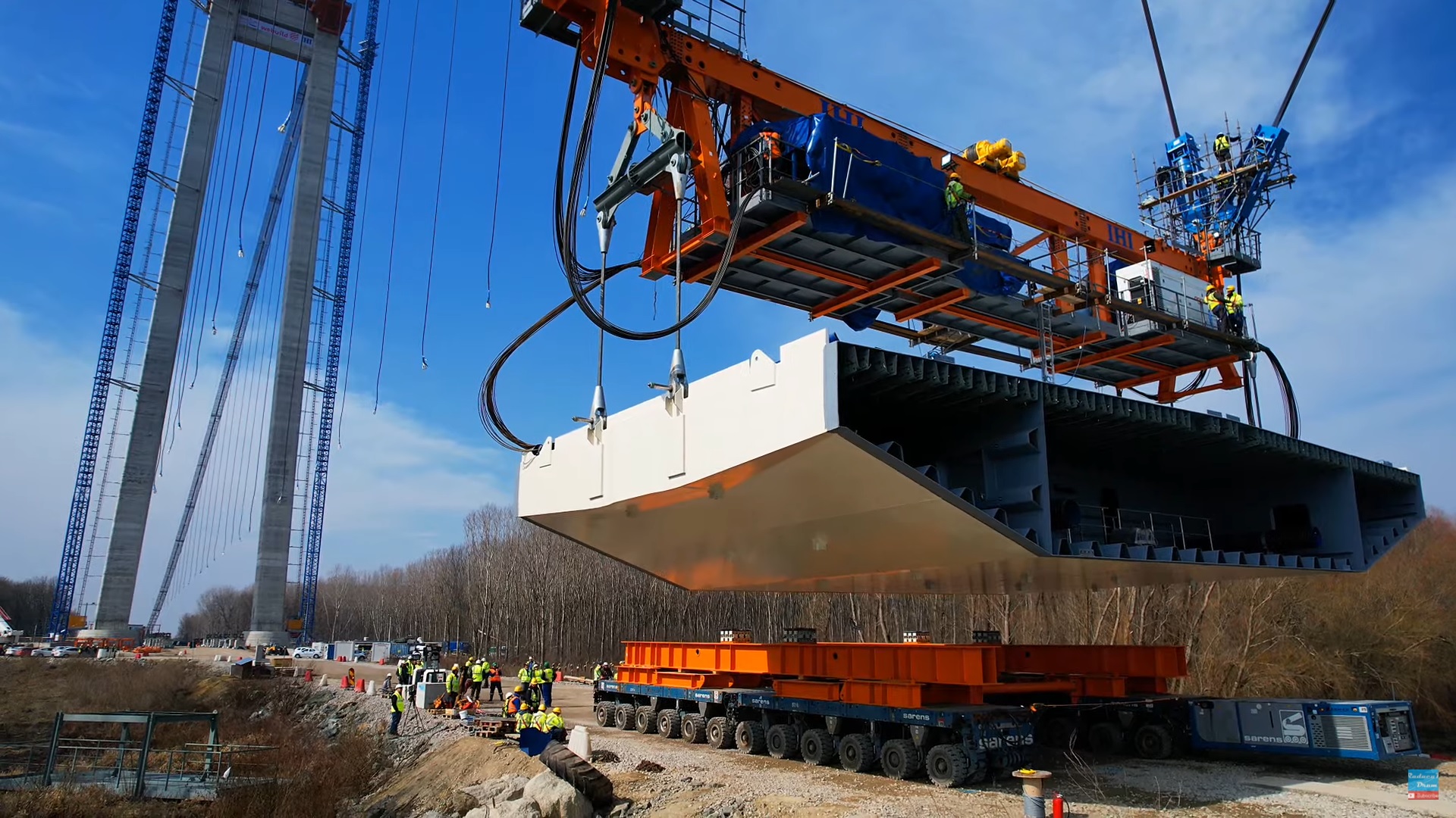 După câteva probe în luna februarie, când primul segment de tablier a fost adus cu barja de la Șantierul Naval Brăila, însă transportat ulterior înapoi din pricina vântului extrem de puternic, undeva în a doua săptămâna a lunii martie procedura a fost reluată și bifată cu succes. Astfel, pe grupul de Facebook ”Pod Suspendat Brăila” a fost prezentat un videoclip marca ”Raducu P Drum” cu imagini de la momentul transportului unui segment de tablier, preluarea și poziționarea acestuia la mal.