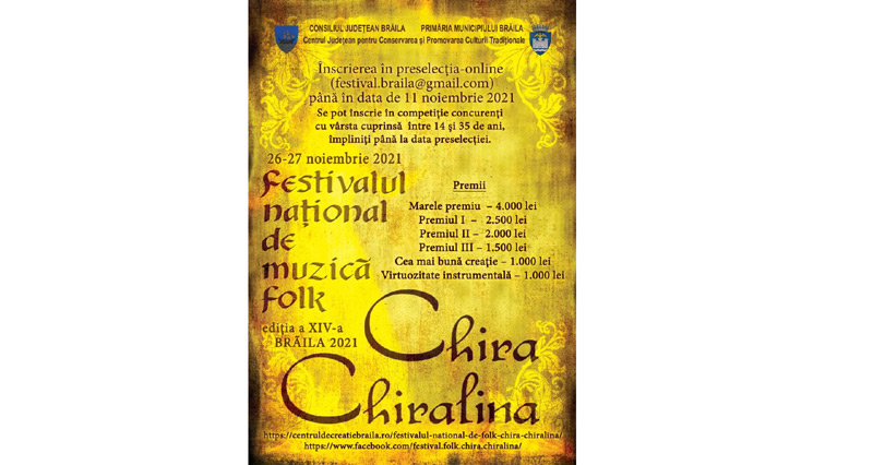 S-a dat startul înscrierilor pentru Festivalul Național de Muzică Folk ”Chira Chiralina” - organizat de Centrul Județean pentru Conservarea și Promovarea Culturii Tradiționale Brăila (Centrul de Creație), cu sprijinul Primăriei Municipiului și al Consiliului Județean Brăila - eveniment cultural de excepție ajuns, anul acesta, la cea de a XIV-a ediție.