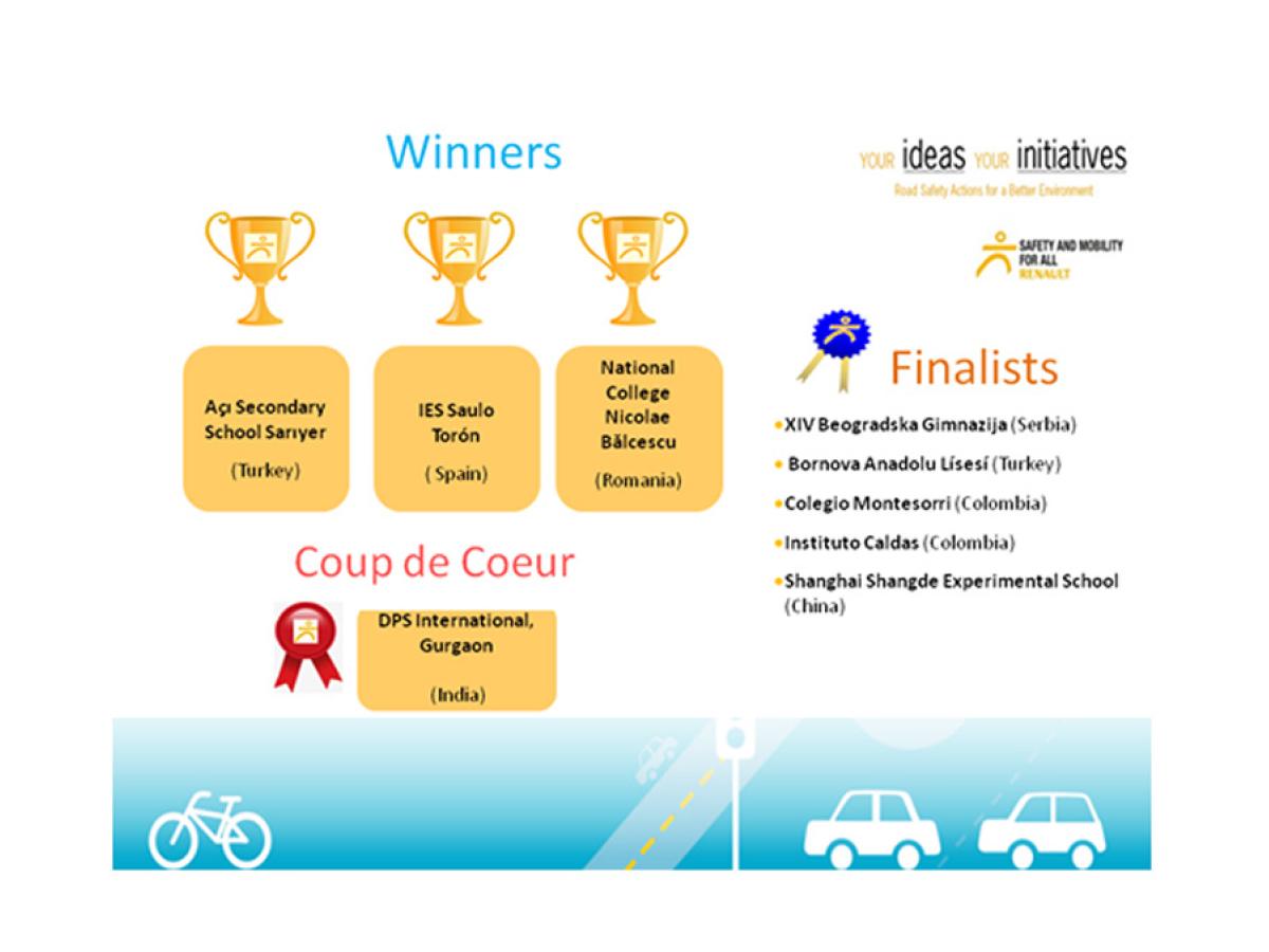 A opta ediţie a Concursului Internaţional “Your Ideas Your Initiatives” – “Safety and Mobility for All” (“Ideile Tale, Initiaţivele Tale” - “Drumuri Mai Sigure pentru un Mediu Mai Bun”) s-a finalizat vineri, 14 iunie, cu un rezultat de excepţie pentru elevii claselor a X–a B şi a IX-a B de la Colegiul Naţional “Nicolae Bălcescu”, îndrumaţi de profesorii Adela Dimov şi Mariana Cîineanu. În urma unei competiţii dificile, derulată sub patronatul Companiei “Renault”, 79 de şcoli din 15 ţări, precum Turcia, China, Brazilia, Columbia, Serbia, Rusia, Spania sau India, au dorit să se numere printre câştigători.