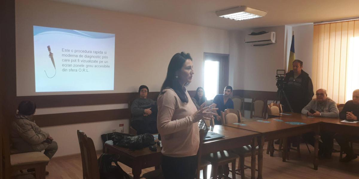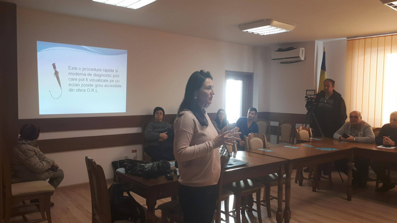 A urmat apoi un program artistic susţinut de elevii Şcolii Postliceale “Dr. Luca”, după care dr. Raluca Arhire a vorbit despre prevenţia afecţiunilor din sfera ORL. Aceasta a explicat ce presupune exact fibroscopia, ilustrând teoria cu un material video. “Fibroscopia se practică atât la persoane adulte, cât şi la copii. Este tolerată mult mai bine faţă de metodele clasice. Clarifică anumite confuzii de diagnostic privind formaţiunile tumorale benigne, cât şi cele tumorale maligne. Ca şi indicaţii ar fi răguşeala care persistă de cel puţin 3 săptămâni, la persoanele de peste 50 ani, tusea cronică, tensiunea corzilor vocale inflamatorii, în boala de reflux gastroesofagian, pentru că refluxul care se întoarce irită foarte mult corzile vocale şi dă senzaţia de arsură şi de a fi ceva în gât. De asemenea, fibroscopia se poate practica şi la nivelul urechii, în cazul de durere la nivelul acesteia ori există scurgere auriculară. Ce vizualizăm? Spre exemplu, la fibroscopia realizată la nivelul fosei nazale, se introduce prin fosa nazală o cameră, adică o fibră subţire de 3 mm (...)”, a precizat dr. Arhire.