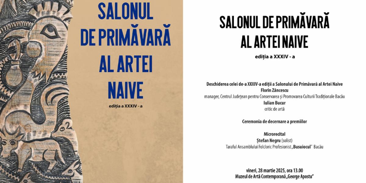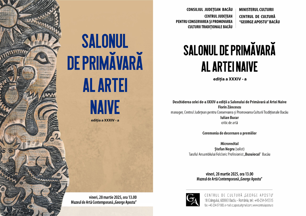 Vineri, 28 martie, începând cu ora 13:00, la Muzeul de Artă Contemporană „George Apostu” din Bacău are loc vernisajul celei de a XXXIV-a Ediții a „Salonului de Primăvară al Artei Naive”. Evenimentul va avea loc la Centrul de Cultură „George Apostu”, din municipiul Bacău. Participă 44 de artiști din județele: Alba, Argeș, Bacău, Brăila, Caraș-Severin, Galați, Iași, Ilfov, Mureș, Prahova, Suceava, Tulcea și Vrancea, care vor expune pe simeze peste 120 de lucrări de artă naivă.
