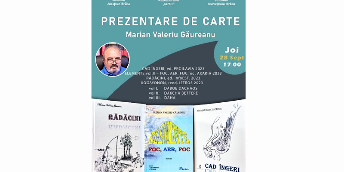 • evenimentul va avea loc joi, 28 septembrie, ora 17.00, în Sala „Regele Ferdinand I și Regina Maria” a Muzeului Brăilei „Carol I” • lucrările, care au văzut lumina tiparului în 2023, aparțin scriitorului brăilean Marian Valeriu Găureanu