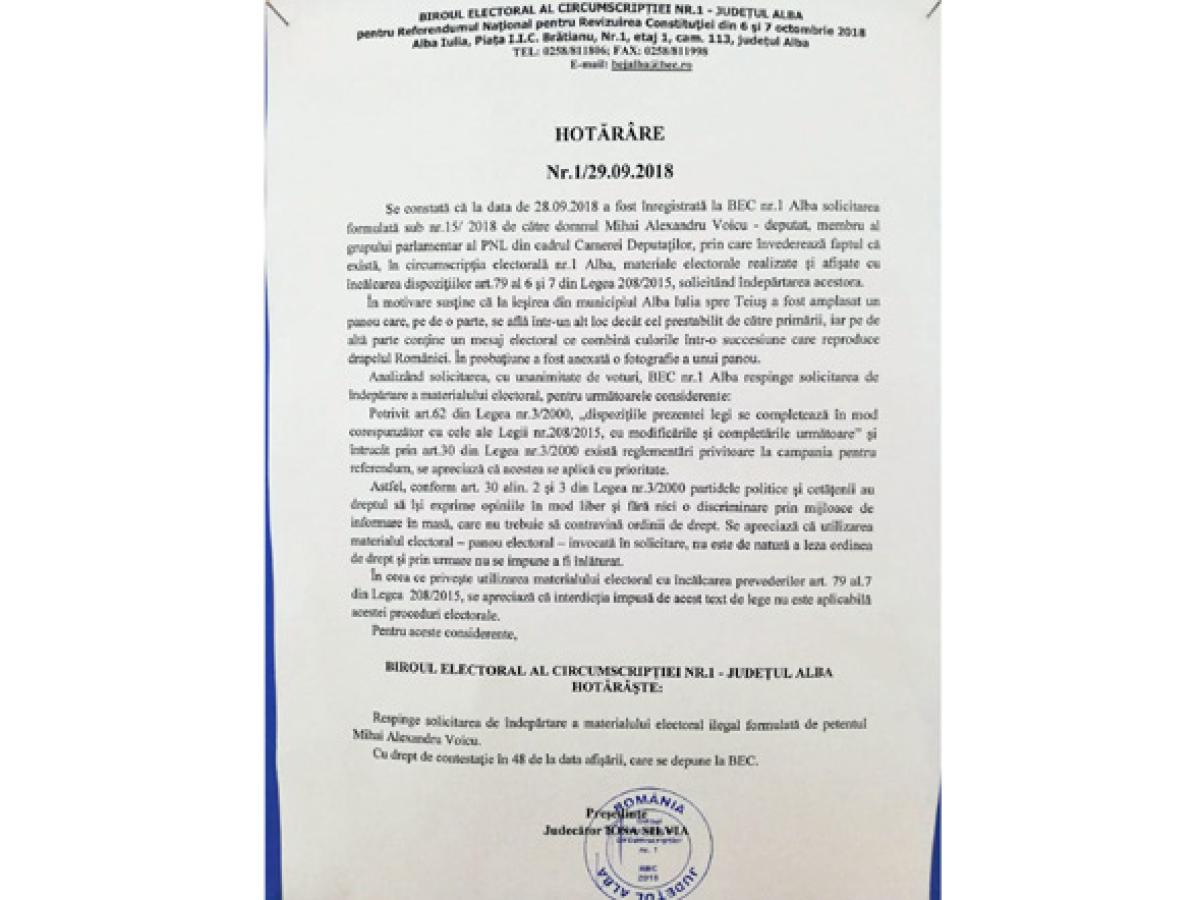 Judecătorul a mai punctat că, deşi au existat sesizări similare în ţară, cu rezoluţii diferite, din punctul său de vedere autoritatea supremă este Biroul Electoral Central, care a tratat primul o astfel de speţă, stabilind că afişajul electoral nu se poate face decât în zonele special amenajate şi nu în altă parte, punându-ne la dispoziţie hotărârea respectivă. În acest context, Biroul electoral Alba a avut o poziţie total opusă, bazată tot pe aceeaşi legislaţie care, iată!, se dovedeşte ambiguă. „Conform art 30 alin 2 şi 3 din legea 3/2000 partidele politice şi cetăţenii au dreptul să-şi exprime opiniile în mod liber fără discriminare prin mijloace de informare în masă care nu trebuie să contravină ordinii de drept. Se apreciază că utilizarea materialului electoral – panou electoral – invocată în solicitare nu este de natură a leza ordinea de drept şi prin urmare nu se impune a fi înlăturat. În ceea ce priveşte utilizarea materialului electoral cu încălcarea prevederilor art 79 alin 7 din Legea 208/2015 se apreciază că interdicţia impusă de acest text de lege nu este aplicabilă acestei proceduri electorale”