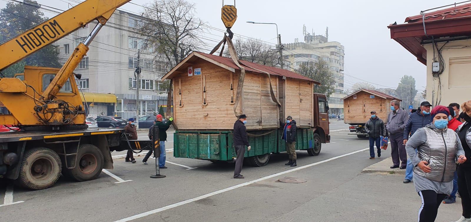 Primăria a început să monteze căsuțe de lemn în parcarea din fața Halei Mari, de pe Str. 1 Decembrie 1918, pentru ca vânzătorii care își desfășurau activitatea în spațiul închis din hală să își poată vinde acolo produsele, după ce au intrat în vigoare noile restricții impuse pentru limitarea răspândirii COVID 19. Potrivit primarului Marian Dragomir, până acum s-au înregistrat 19 cereri din partea comercianților, motiv pentru care vor fi montate tot atâtea căsuțe. Dacă vor mai fi primite solicitări, se vor căuta soluții pentru a mai aduce și altele, funcție de spațiul disponibil, ne-a spus edilul-șef. Acesta a precizat că fiecare incintă va fi conectată la rețeaua electrică, astfel încât comercianții să aibă posibilitatea să foloască instalațiile frigorifice de care au nevoie pentru expunerea mărfii în condiții corespunzătoare. Aceștia vor achita curentul consumat.