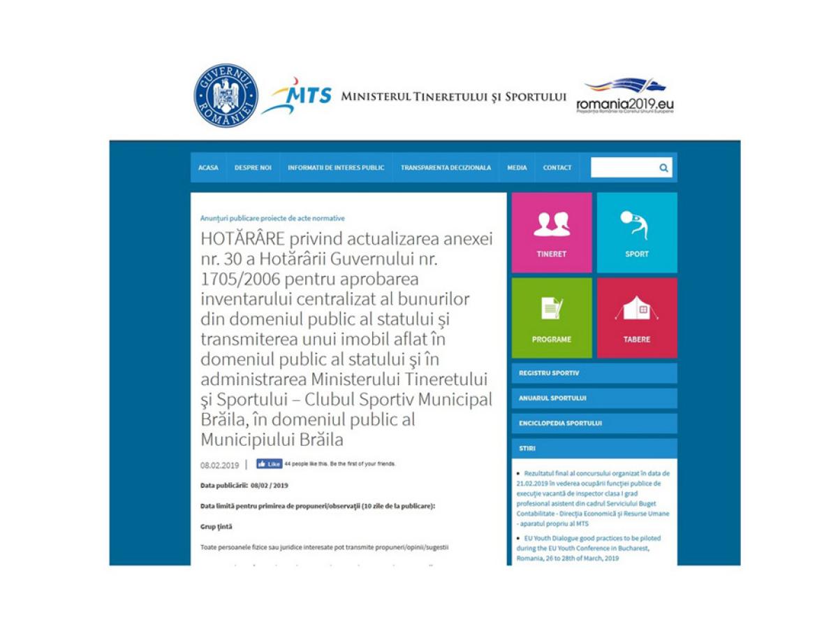 Aşa cum am precizat, proiectul de act normativ aflat în dezbatere publică pe site-ul MTS, alături de altele asemănătoare, propune să actualizeze valoarea de inventar şi să modifice caracteristicile tehnice ale stadionului de atletism din Brăila, conform unui raport de evaluare din 05 octombrie 2018 şi a conţinutului cărţii funciare.