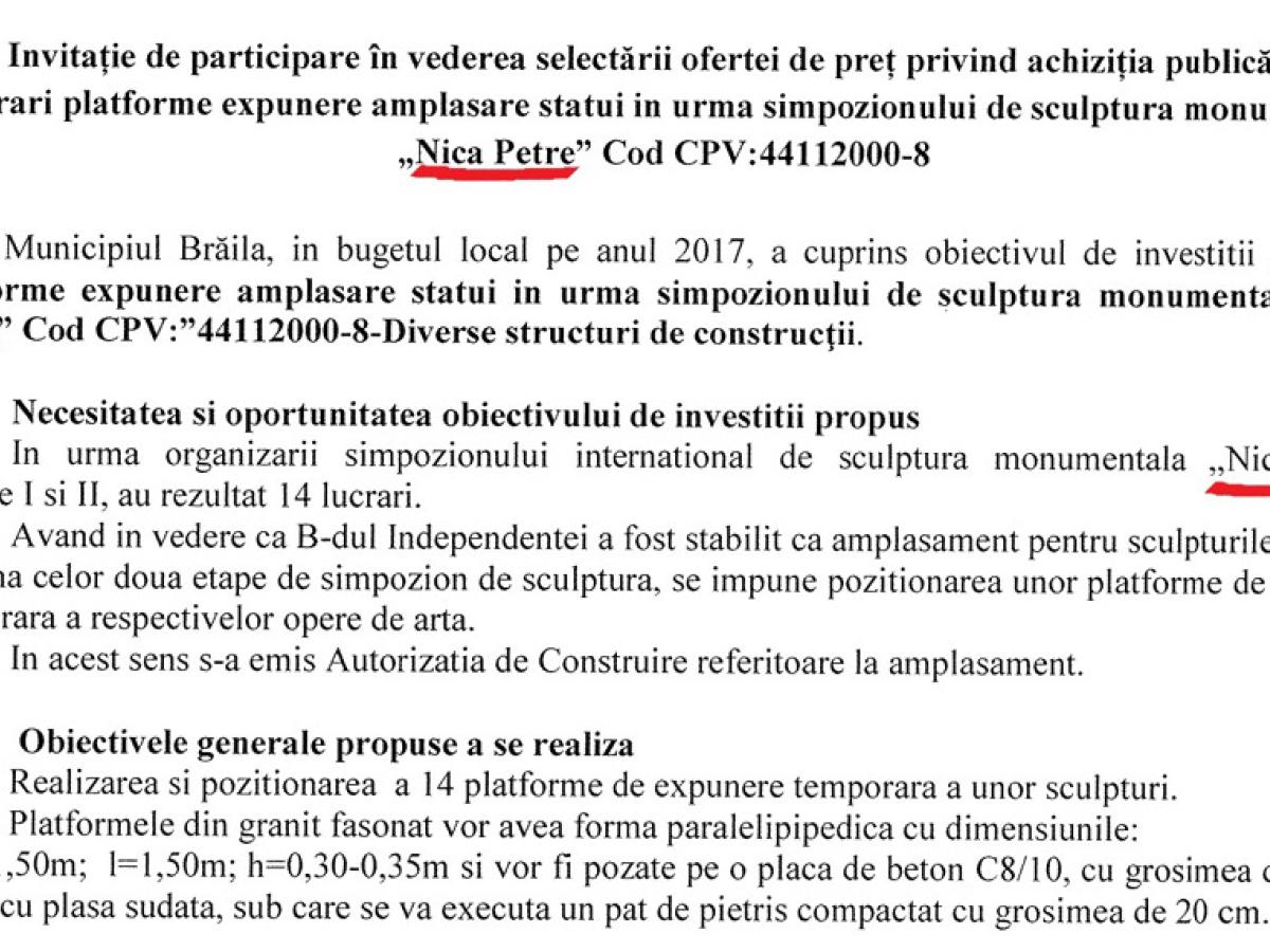 Municipalitatea a lansat în SEAP procedura achiziţiei publice a 14 platforme de expunere a statuilor realizate în cadrul simpozionului de sculptură monumentală Nică Petre, ediţiile I şi II, bugetulalocat al investiţiei fiind de 98.000 lei, fără TVA. De la firma care va câştiga acest contract de lucrări se aşteaptă realizarea a 14 platforme din granit fasonat înalte de 30 - 35 cm care vor fi pozate pe o placă din beton armat cu plasă sudată (groase de 10 cm), sub care se va executa un pat de pietriş cu grosime de 20 cm. Aceste structuri vor fi amplasate pe bulevardul Independenţei. Durata acestui contract este de 60 de zile de la data emiterii ordinului de începere, iar garanţia cerută este de minim 12 luni.