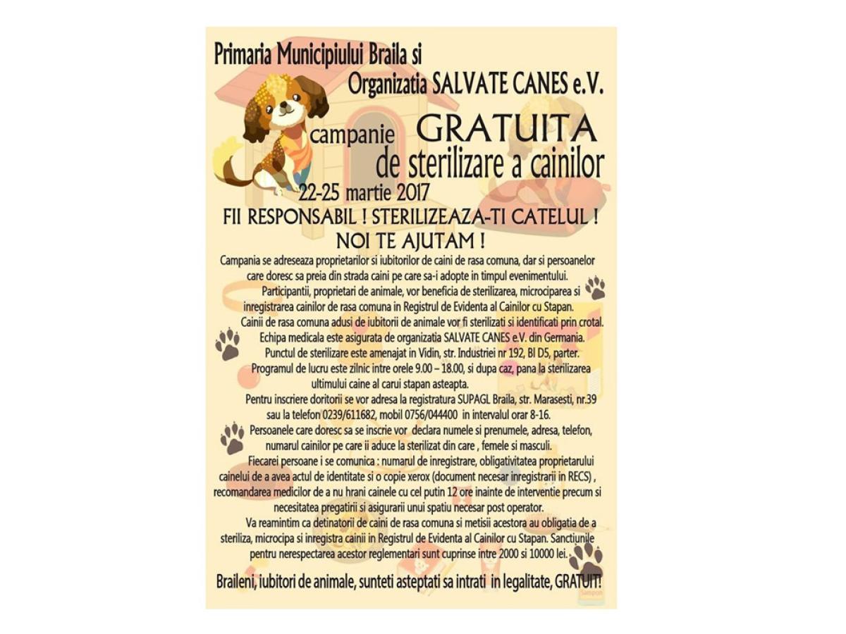 “Echipa medicală va fi asigurată de SALVATE CANES e.V. din Germania, pe bază de voluntariat”, a anunţat primarul Dragomir, îndemnând cât mai mulţi brăileni să aducă patrupedele la sterilizat.