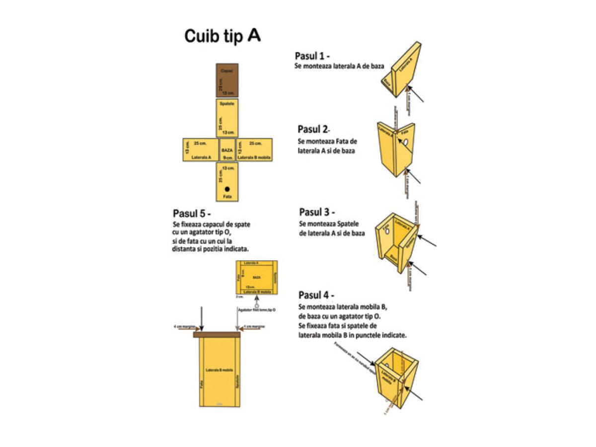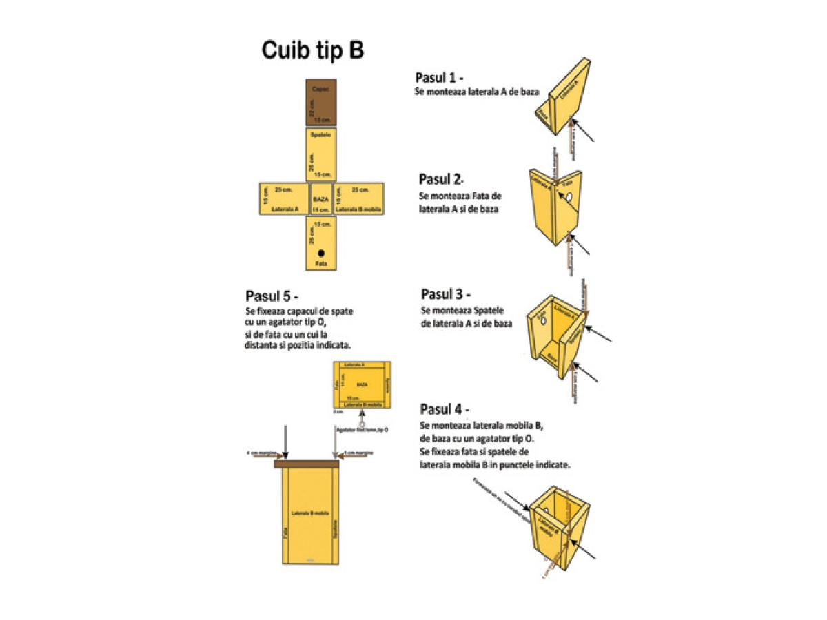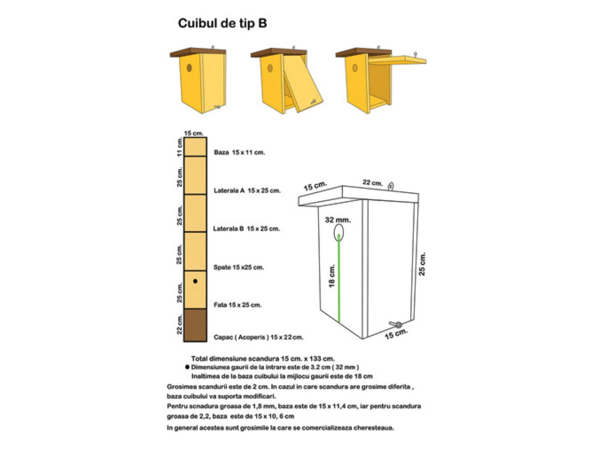 - Este foarte important să menținem materialul și dimensiunile potrivite pentru speciile vizate. Aceste informații (materialul și dimensiunea) se bazează pe mai mulți ani de cercetări și observații din partea ornitologilor, pentru a găsi varianta cea mai potrivită și eficientă, de a înlocui fisuri, scorburi sau mici orificii naturale care sunt folosite de către speciile de păsări sălbatice.