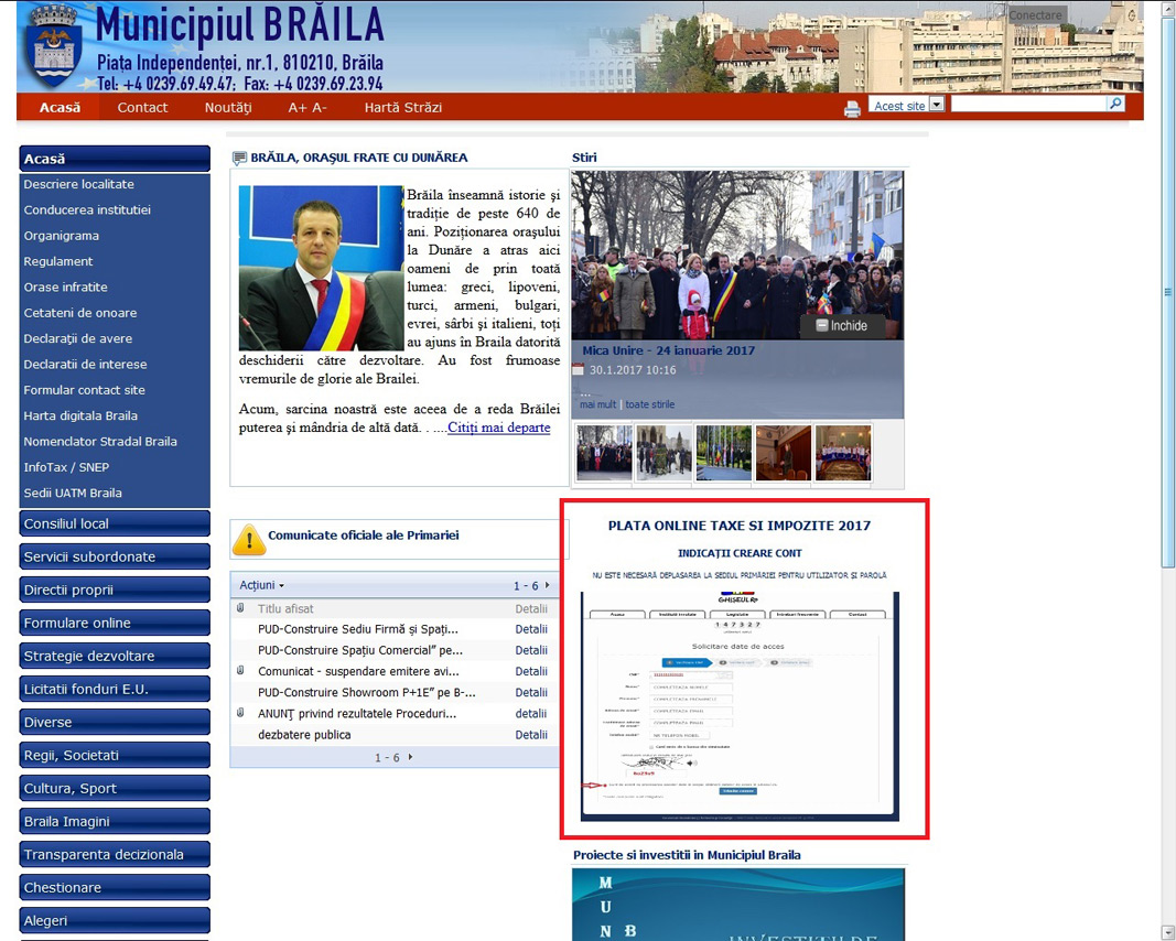 Reamintim că Primăria Brăila şi-a redeschis ghişeele pentru brăilenii care vor să scape de plata impozitelor şi taxelor locale încă din data de 9 ianuarie. Acestea sunt deschise zilnic, de la 08:00 la 16:00, în timp ce joi programul se prelungeşte până la 18:00. De asemenea, trebuie punctat că şi pe pagina web a primăriei, la butonul “Acasă”, a fost postat un link direct către portalul Ghiseul.ro prin intermediul căruia brăilenii se pot achita de obligaţiile fiscale fără bătaie de cap, de acasă, din faţa calculatorului. Tot acolo, se specifică faptul că nu este necesară deplasarea la sediul Primăriei pentru a cere un nume de utilizator şi parolă.