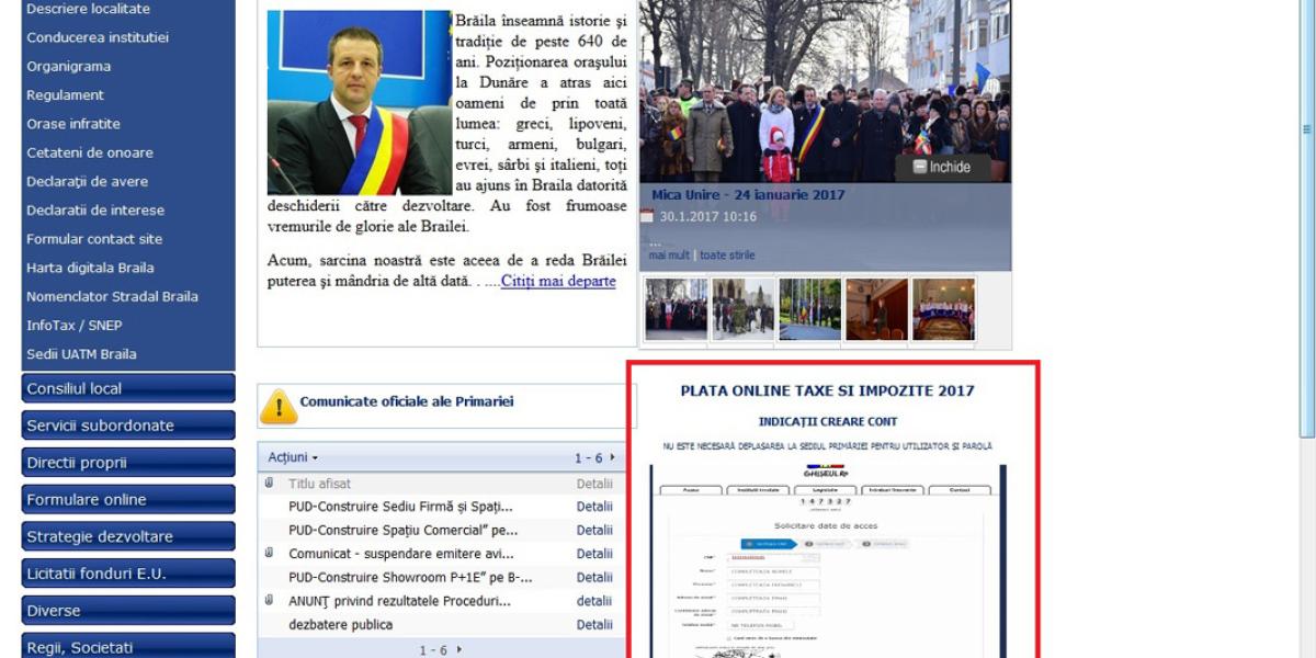 Primarul Marian Dragomir a declarat, recent, că este mulţumit de faptul că o parte dintre brăileni a înţeles utilitatea plăţii online a taxelor şi impozitelor, astfel că nu s-a mai ajuns la cozi interminabile la ghişee. Chiar şi aşa, edilul-şef a ţinut să reamintească faptul că ar vrea ca din ce în ce mai mulţi locuitori ai oraşului să profite de acest serviciu şi să încerce să facă plata prin intermediul calculatorului.