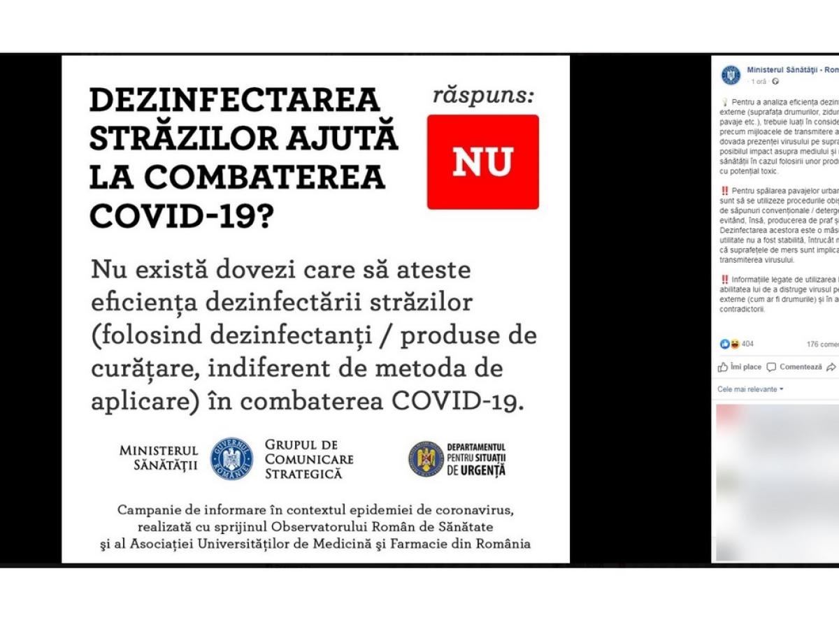 ”Pentru a analiza eficiența dezinfectării mediilor externe (suprafața drumurilor, ziduri de protecție, pavaje etc.), trebuie luați în considerare factori precum mijloacele de transmitere a Coronavirus, dovada prezenței virusului pe suprafețe, precum și posibilul impact asupra mediului și riscul asupra sănătății în cazul folosirii unor produse nepotrivite, cu potențial toxic. Pentru spălarea pavajelor urbane, recomandările sunt să se utilizeze procedurile obișnuite, pe bază de săpunuri convenționale / detergenți convenționali, evitând, însă, producerea de praf și aerosoli. Dezinfectarea acestora este o măsură a cărei utilitate nu a fost stabilită, întrucât nu există dovezi că suprafețele de mers sunt implicate în transmiterea virusului. Informațiile legate de utilizarea hipocloritului și abilitatea lui de a distruge virusul pe suprafețe externe (cum ar fi drumurile) și în aer sunt contradictorii”, se arată în comunicatul Ministerului Sănătății, nr. 4.206 din 03.04.2020.