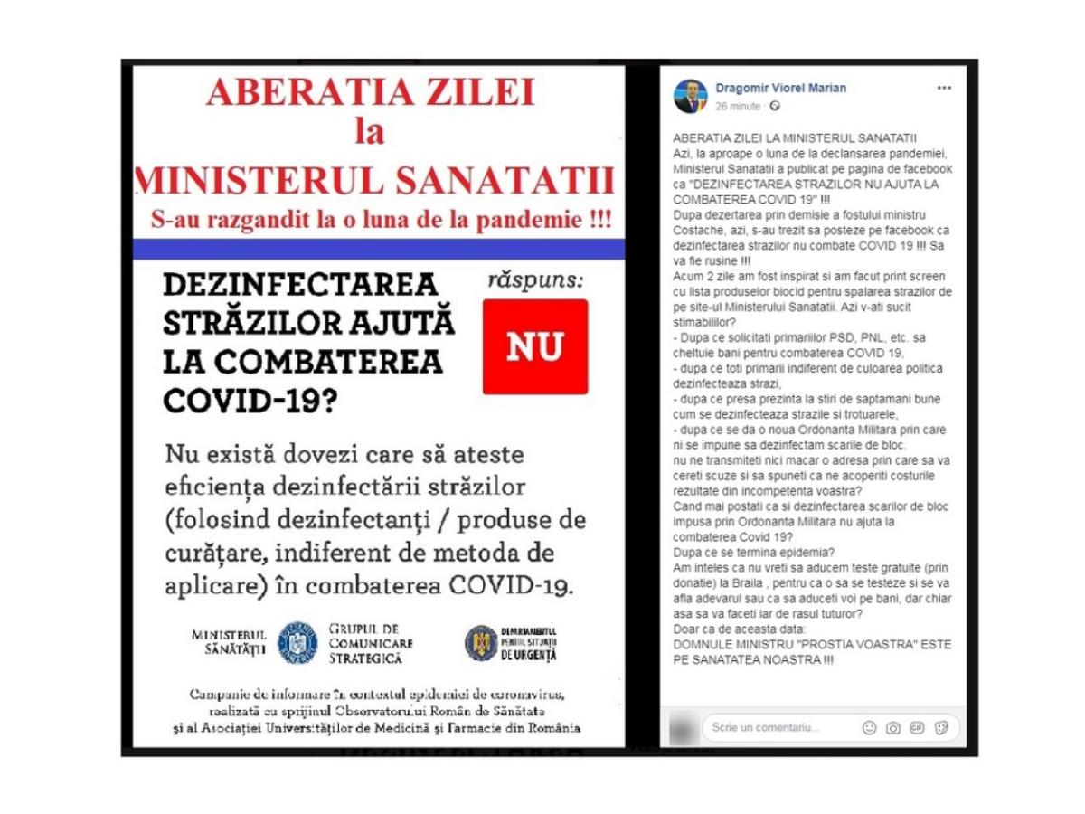 ”Azi, la aproape o lună de la declanșarea pandemiei, Ministerul Sănătății a publicat pe pagina de facebook că «Dezinfectarea străzilor nu ajută la combaterea COVID-19»!!! După dezertarea prin demisie a fostului ministru Costache, azi, s-au trezit să posteze pe facebook că dezinfectarea străzilor nu combate COVID-19 !!! Să vă fie rușine!!! Acum 2 zile am fost inspirat și am făcut print screen cu lista produselor biocid pentru spălarea străzilor de pe site-ul Ministerului Sănătății. Azi v-ați sucit stimabililor? După ce solicitați primăriilor PSD, PNL etc. să cheltuie bani pentru combaterea COVID 19, după ce toți primarii indiferent de culoarea politică dezinfectează străzi, după ce presa prezintă la știri de săptămâni bune cum se dezinfectează străzile și trotuarele, după ce se dă o noua Ordonanță Militară prin care ni se impune să dezinfectăm scările de bloc... Nu ne transmiteți nici măcar o adresă prin care să vă cereți scuze și să spuneți că ne acoperiți costurile rezultate din incompetența voastră? Când mai postați că și dezinfectarea scărilor de bloc impusă prin Ordonanța Militară nu ajută la combaterea Covid-19? După ce se termină epidemia? Am înțeles că nu vreți să aducem teste gratuite (prin donație) la Brăila , pentru că o să se testeze și se va afla adevărul sau ca să aduceți voi pe bani, dar chiar așa să vă faceți iar de râsul tuturor? Doar că de această dată: domnule ministru, ”prostia voastră” este pe sănătatea noastră!!!”, a afirmat Dragomir.