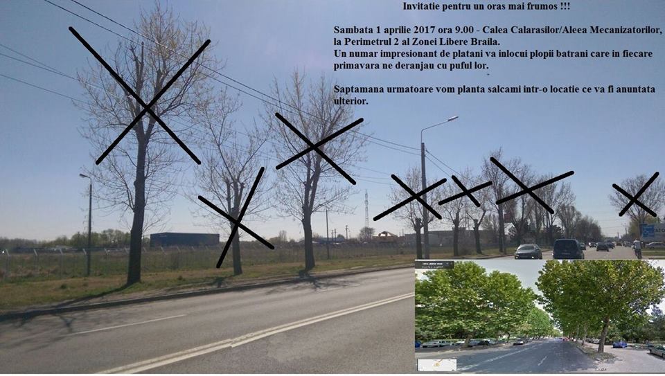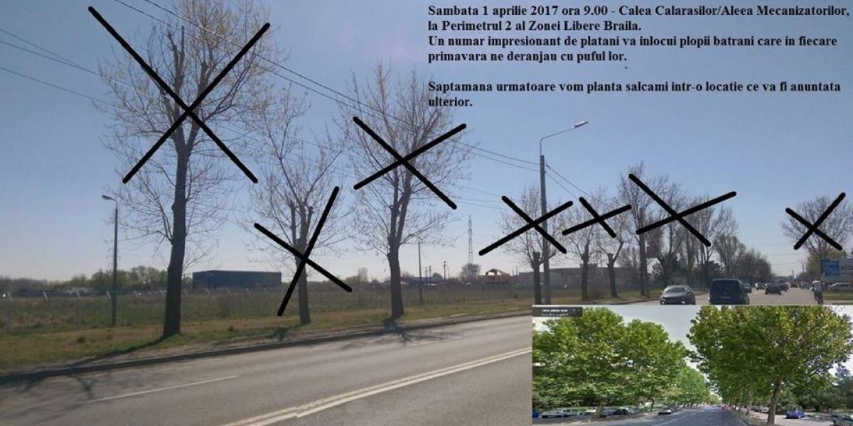Primarul Marian Dragomir a lansat o nouă invitația la adresa brăilenilor care vor să se implice pentru plantările de arbori la nivelul municipiului. Este vorba despre o acțiune programată, sâmbătă dimineață, începând cu ora 9:00, pe Calea Calărașilor colț cu Aleea Mecanizatorilor, la Perimetrul 2 al Zonei Libere Brăila. Potrivit edilului-șef deja au fost tăiați plopii din zona respectivă, s-au săpat gropile cu o mașină specială, iar acum se vor planta platani, specie care mobilează Calea Călărașilor.