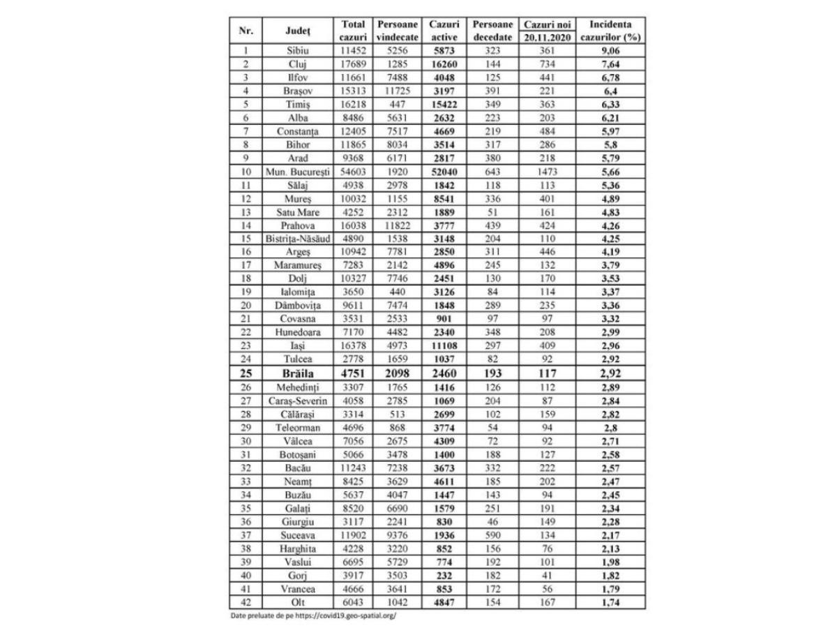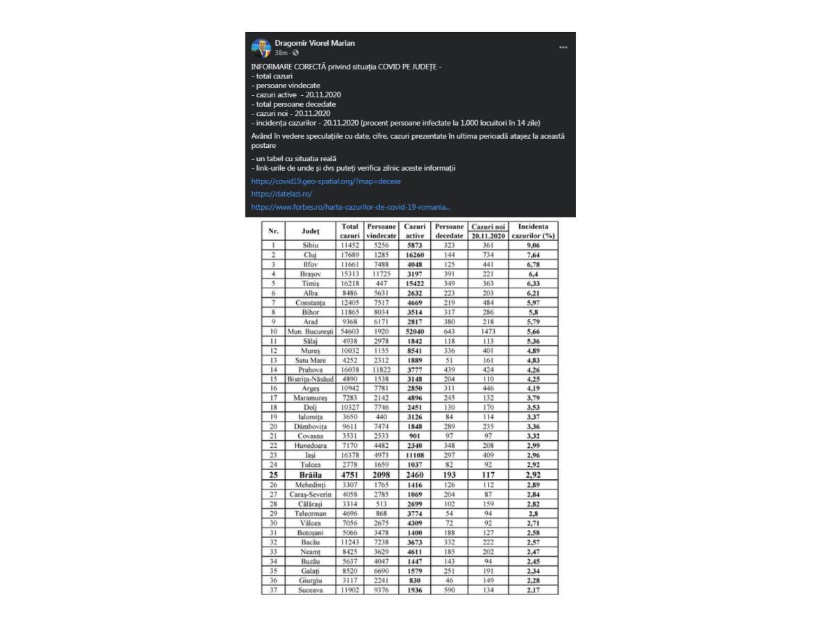 ”INFORMARE CORECTĂ privind situația COVID PE JUDEȚE: total cazuri; persoane vindecate; cazuri active - 20.11.2020; total persoane decedate; cazuri noi - 20.11.2020; incidența cazurilor - 20.11.2020 (procent persoane infectate la 1.000 locuitori în 14 zile). Având în vedere speculațiile cu date, cifre, cazuri prezentate în ultima perioadă, atașez la această postare un tabel cu situația reală; link-urile de unde și dvs. puteți verifica zilnic aceste informații”, se arată în postarea primarului Municipiului Brăila.
