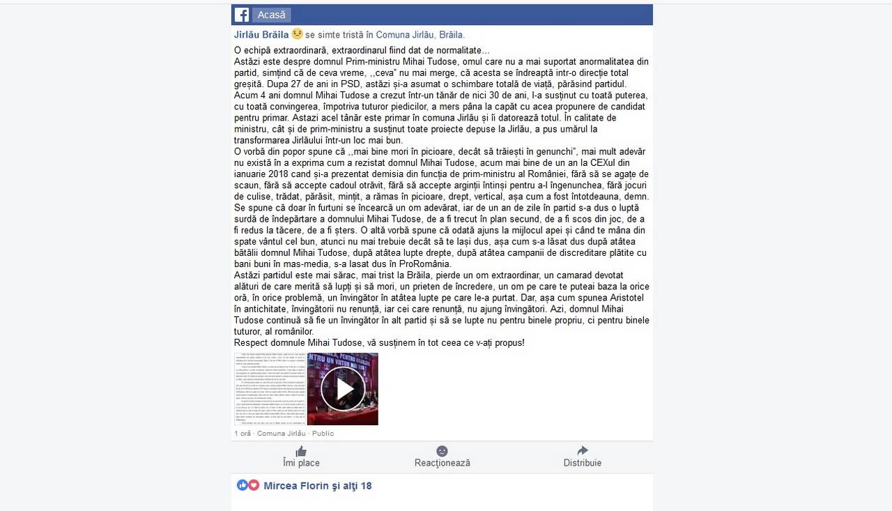 * organizația PSD din comuna Jirlău condusă de primarul Daniel Drăguț a postat pe rețelele de socializare un mesaj de susținere pentru Mihai Tudose, după decizia acestuia de a pleca din PSD * în mesaj se vorbește despre „anormalitatea din PSD” și faptul că Tudose nu a mai suportat direcția greșită impusă din vârf * ”Respect domnule Mihai Tudose, vă susținem în tot ceea ce v-ați propus!”, i-au transmis PSD-iștii din Jirlău fostului premier