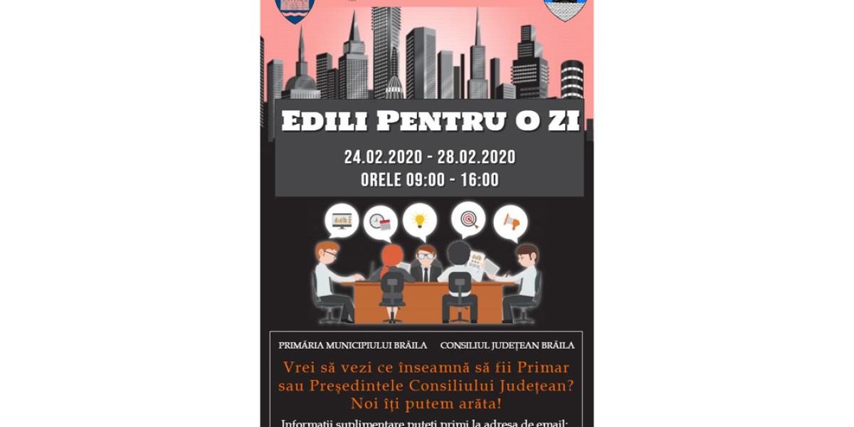 “Edili pentru o zi” este programul prin care adolescenţii şi tinerii din Brăila au şansa de a juca rolul de primar, preşedinte de Consiliu Judeţean, respectiv consilieri locali şi judeţeni. În perioada 24-28 februarie, în fiecare zi, tinerii cu vârste cuprinse între 14 şi 20 de ani vor avea oportunitatea de a înţelege importanţa, rolul şi funcţiile instituţiilor locale şi judeţene, familiarizarea cu procesul decizional şi oferirea unei viziuni practice asupra a ceea ce reprezintă în mod real activitatea Primarului, a Preşedintelui Consiliului Judeţean, şi desigur, a consilierilor locali/judeţeni şi angajaţilor din aceste instituţii.