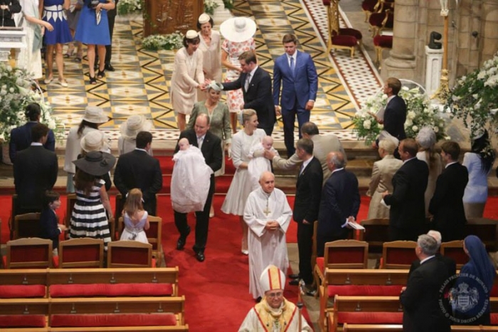 Bebeluşii au sosit în faţa catedralei în braţele dădacelor lor, înainte de a fi preluaţi de părinţii lor pentru a trece pragul bisericii în sunetul a 21 de salve de tun pentru fiecare copil. Sute de persoane au fost invitate la ceremonia la care au asistat, de asemenea, surorile suveranului, Caroline şi Stephanie, alături de copiii acestora, cu excepţia lui Charlotte Casiraghi (soţia comedianului Gad Elmaleh). După ceremonie, părinţii au mers pe jos de la catedrală până la reşedinţa oficială, situată în apropiere, oferind prima baie de mulţime bebeluşilor.