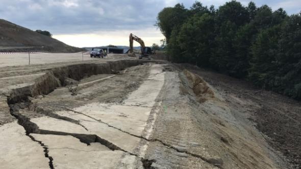 Terasamentul şoselei aflate în prezent în lucru s-a surpat din cauza alunecărilor de teren din zonă. Reprezentanţii companiei de drumuri spun că au trimis echipe la faţa locului pentru a evalua situaţia.