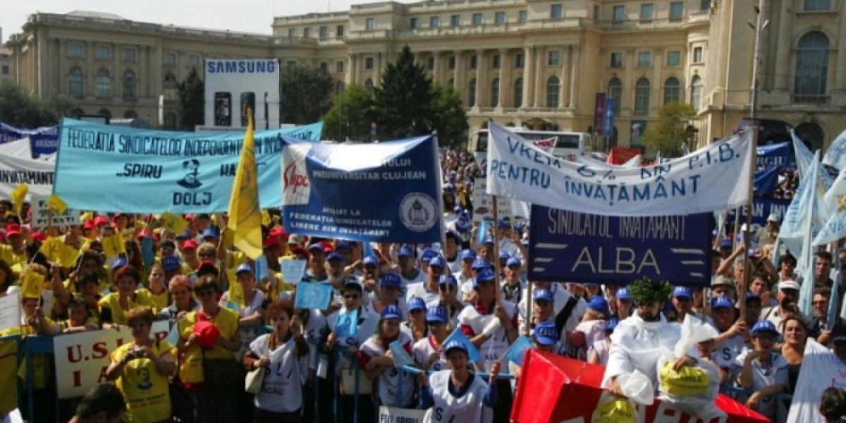 Peste 7.000 de cadre didactice au protestat miercuri în Capitală, au plecat în marş de la Guvern spre Parlament. Manifestanţii din primul rând al coloanei au purtat tricouri inscripţionate cu litere care formează mesajul "SALVAţI EDUCAŢIA". Protestul s-a încheiat în Piaţa Constituţiei, la ora 14.00, nefiind înregistrate incidente.
