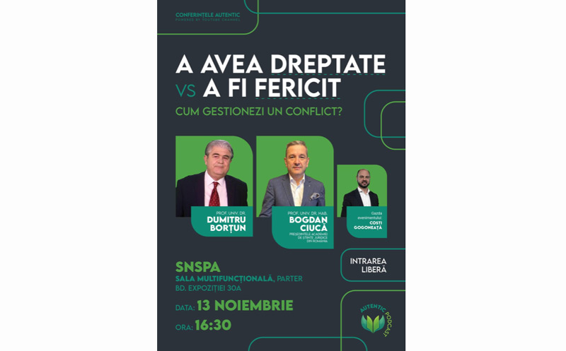 Luni, 13 noiembrie 2023, de la ora 16:30, te așteptăm la cea de-a 13-a conferință AUTENTIC, care se va desfășura la Școala Națională de Studii Politice și Administrative (SNSPA) din București, Sala Multifucțională (parter).