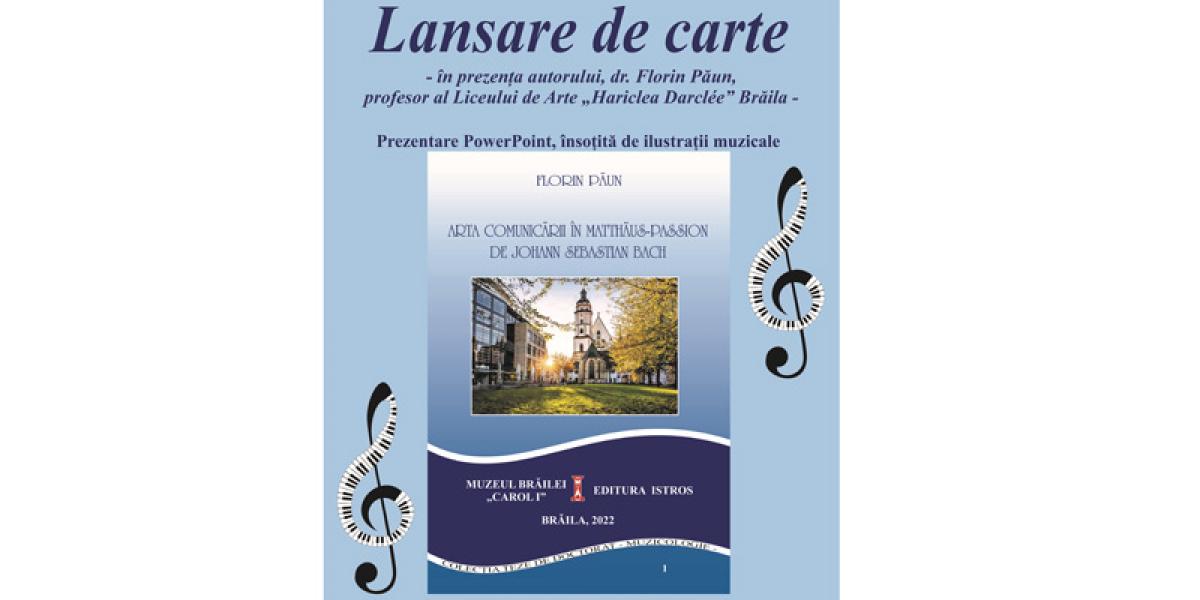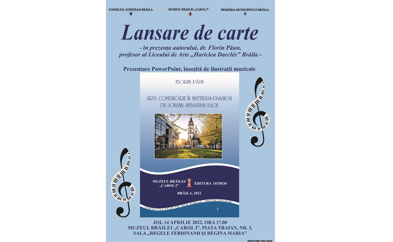 Potrivit comunicatului trimis de instituția gazdă, brăilenii cu gust pentru muzică și nu numai sunt invitați în după-amiaza zilei de joi, 14 aprilie 2022, ora 17.00, la lansarea cărții intitulate "Arta comunicării în Matthus-passion de Johann Sebastian Bach", autor prof. Florin Păun, cadru didactic la Liceul de Arte "Hariclea Darclee" Brăila.