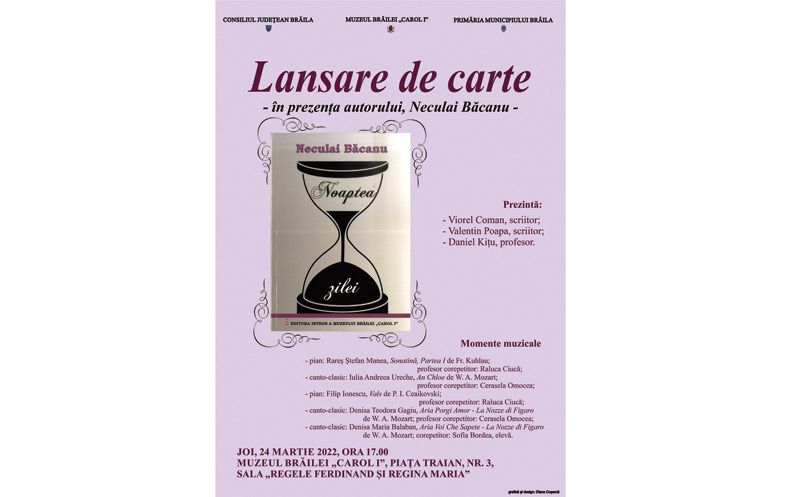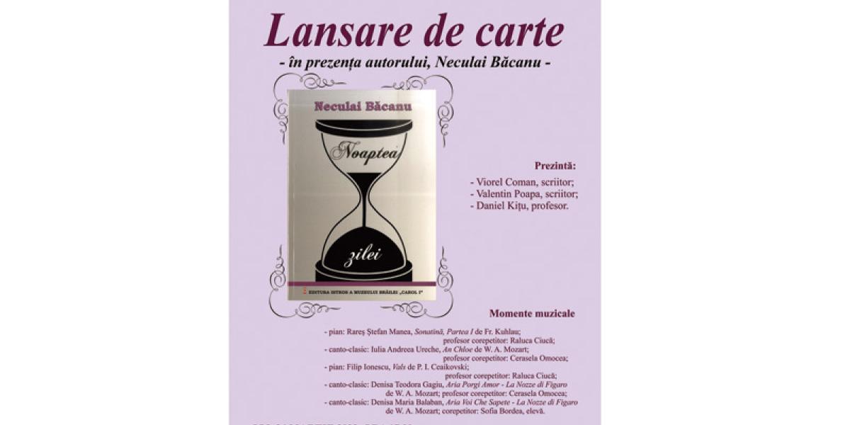 Sala "Regele Ferdinand I și Regina Maria" a Muzeului Brăilei "Carol I" (Piața Traian nr. 3) găzduiește joi, 24 martie, de la ora 17.00, lansarea volumului de poezie "Noaptea zilei", autor Neculai Băcanu, profesor la Colegiul Economic "Ion Ghica" din Brăila. Volumul profesorului Băcanu a apărut la Editura "Istros" a Muzeului Brăilei "Carol I".