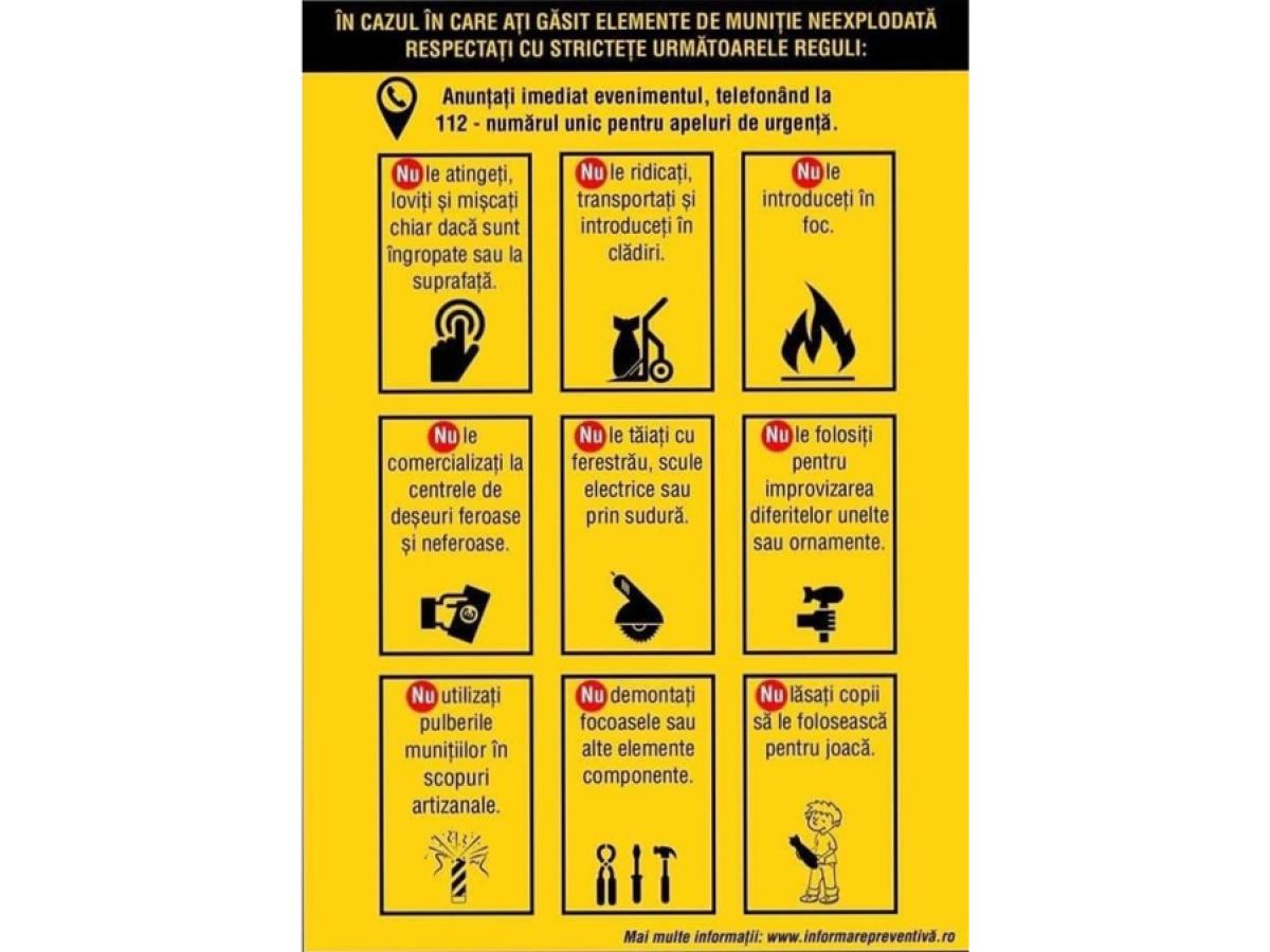 Având în vedere că în perioada următoare se vor intensifica lucrările agricole de primăvară, specialiștii ISU îndeamnă cetățenii ca, la descoperirea unor astfel de elemente de muniție, să oprească activitatea în zona respectivă și să informeze organele competente, furninzând informații privind localizarea acestora. Trebuie anunţate de urgenţă Inspectoratul Judeţean pentru Situaţii de Urgenţă, organele de poliţie sau autorităţile publice locale.