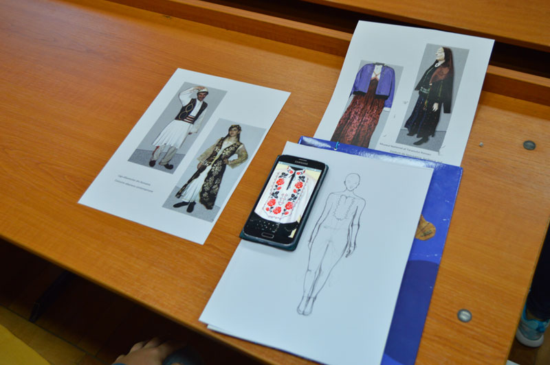 Ca echipa să vadă dacă cei mici au reţinut ce li s-a povestit, aceştia au primit o foaie pe care aveau schiţată o siluetă. Pe lângă aceasta, ei au avut de ales dintre o mulţime de costume tradiţionale printate, specifice bulgarilor, grecilor, turcilor, evreilor, ruşilor lipoveni, armenilor şi a altor etnii. În acest fel, ei au îmbrăcat manechinul în costume, colorând şi interpretând vestimetaţia în manieră proprie. Cu ajutorul doamnei profesor de desen Nicoleta Olteanu, au rezultat lucrări interesante, iar cei mici au dat dovadă de talent şi simţ cromatic. Pentru a le demonstra participanţilor că o etnie are cultură proprie, ce constă în costume, tradiţii, obiceiuri, limbă proprie, elevii au scris pe un cub de carton pe fiecare faţă a acestuia numele proiectului “În căutarea unui nou «acas㻓 în limba turcă şi greacă.