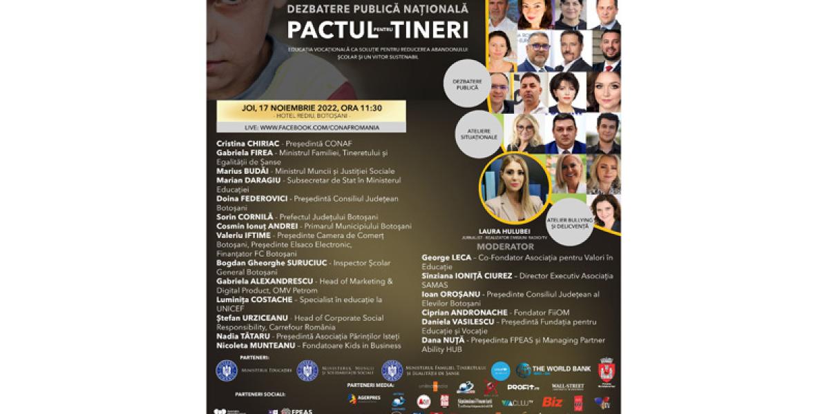 Confederația Națională pentru Antreprenoriat Feminin (CONAF) organizează astăzi, 17 noiembrie 2022, la Hotel Rediu Botoșani, începând cu ora 11:30, cea de a treia dezbatere a proiectului național „Pactul pentru Tineri”, în parteneriat cu Ministerul Educației, Ministerul Familiei, Tineretului și Egalității de Șanse, Ministerul Muncii și Solidarității Sociale, UNICEF și Banca Mondială.