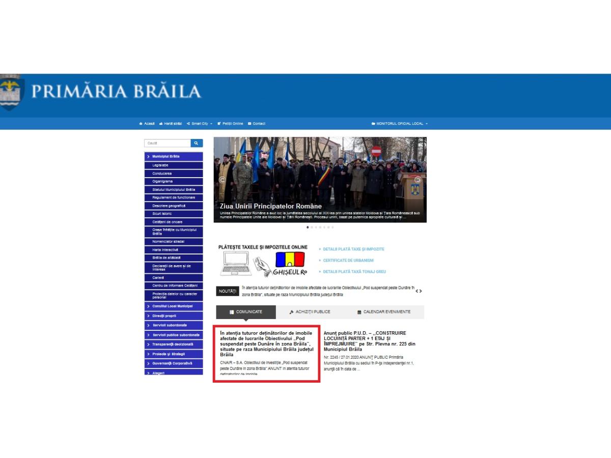 * este vorba despre un anunț postat pe site-ul Primăriei Brăila, din partea CNAIR * proprietarii tuturor imobilelor afectate de coridorul de expropriere pentru lucrările podului peste Dunăre sunt chemați la Primărie, în zilele de 3 și 4 februarie, începând cu ora 10:00, la camera 404