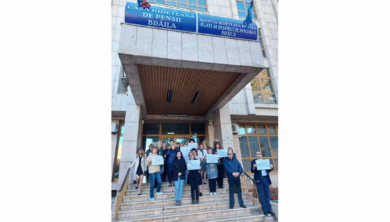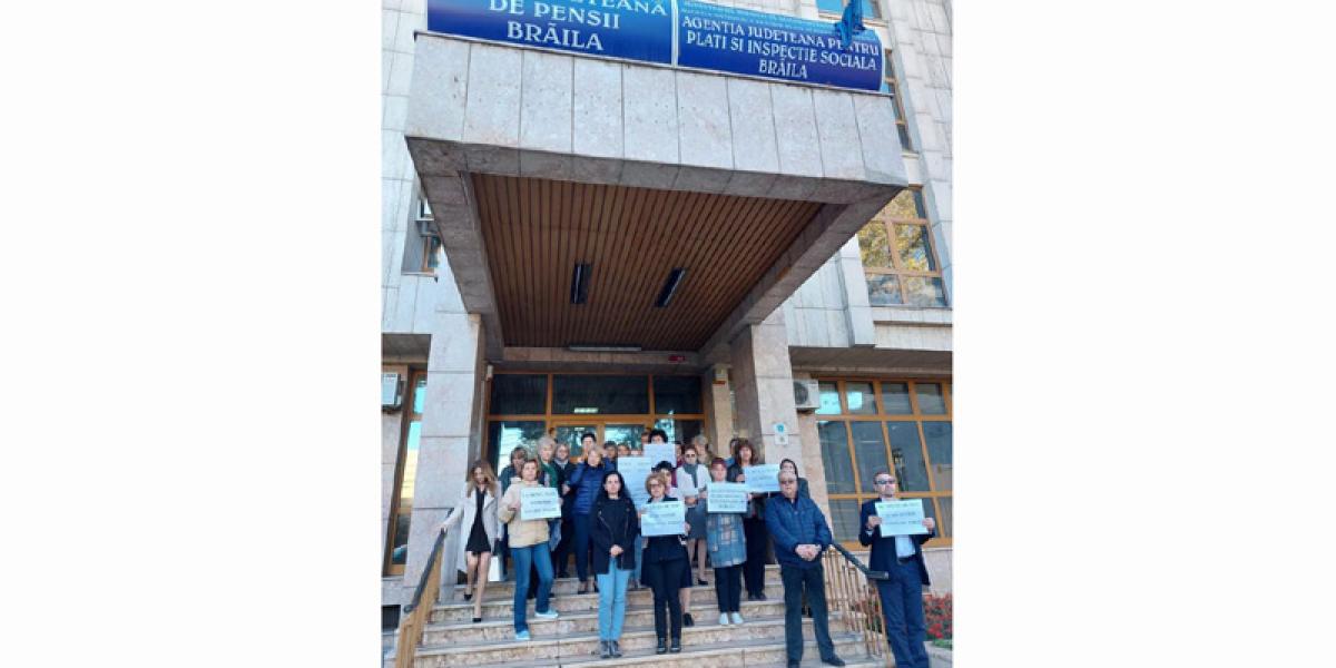 • angajații Casei Județene de Pensii Brăila au ieșit, din nou, din birouri în semn de protest față de salariile mici și inechitățile din sistem și cer respectarea drepturilor legale • o acțiune similară a avut loc, simultan, în mai multe județe, iar revendicările au fost aceleași • acesta este al doilea protest spontan organizat de casele de pensii, primul fiind declanșat luna trecută