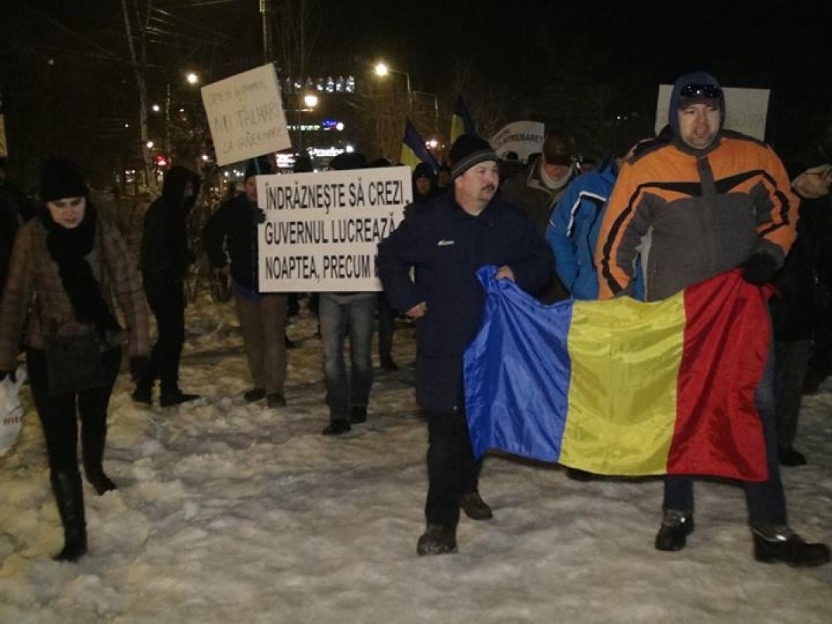 De pe platoul din fața prefecturii, coloana de manifestanți a plecat spre bariera Călărașilor, apoi spre sediul PSD și înapoi la prefectură. S-a mers și s-a demonstrat pașnic, fără a fi perturbat traficul auto. Oricum, ca semn de solidaritate, în dreptul coloanei de protestatari, cei mai mulți șoferii claxonau și scandau împreună cu strada. La protest au fost și persoane în vârstă, și copii, și câini. Nu au fost semnalate incidente, iar pe tot parcursul protestelor forţele de ordine i-au însoţit pe manifestanţi.
