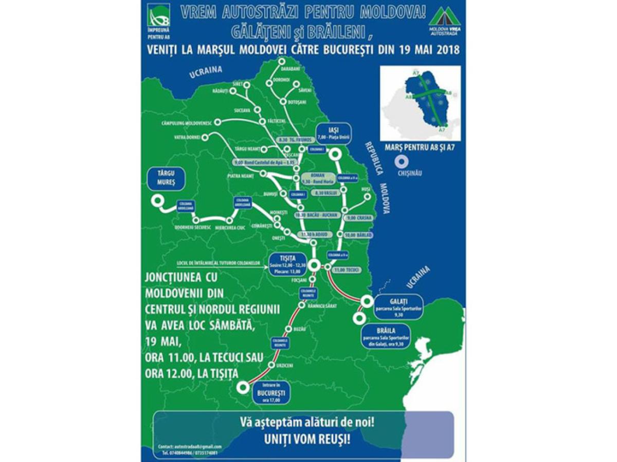 • prima acţiune concretă a organizaţiilor semnatare este participarea la marşul motorizat spre Bucureşti, pentru a atrage atenţia asupra necesităţii construirii unei autostrăzi care să lege Moldova de Capitală • asociaţiile locale mai vor construirea podului peste Dunăre, dar şi a unui aeroport în zona Brăila-Galaţi