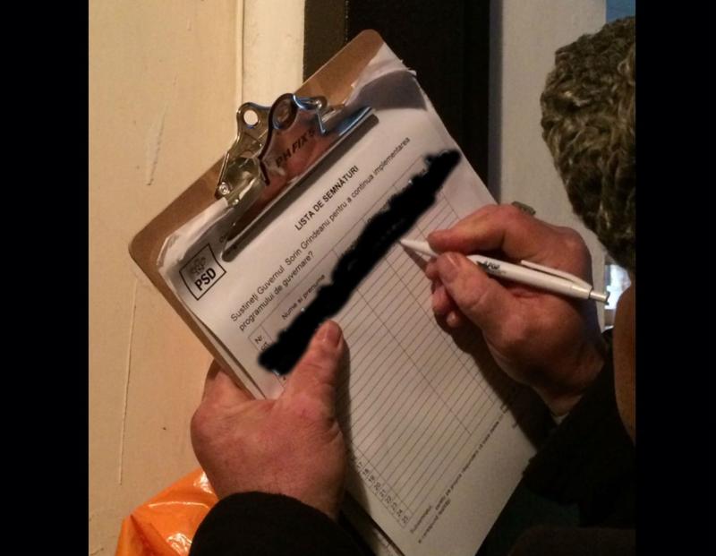 Un mesaj venit ieri pe adresa Digi24 arată că social-democrații au trecut la nivelul următor: din bloc în bloc și din ușă în ușă. „A sunat la ușă un domn să mă întrebe dacă susțin Guvernul Grindeanu, fluturând niște foi în mână. L-am întrebat cine l-a trimis și mi-a spus cu seninătate «sincer vă spun, PSD m-a trimis să adun semnături, apoi trimitem lista la București, la domnul Dragnea»”, ne-a comunicat o telespectatoare Digi24 din Piatra Neamț. Potrivit acesteia, după ce ea a refuzat să semneze, trimisul PSD a sunat la vecina sa, o doamnă în vârstă, pe care a convins-o ușor să-și dea datele personale spre a fi completate în tabel. „Au luat toate apartamentele din bloc la rând. Mi se pare josnic să păcălești niște bieți bătrâni care nu prea știu despre ce e vorba”, a mai transmis telespectatoarea Digi24, care a vrut să-și păstreze anonimatul.