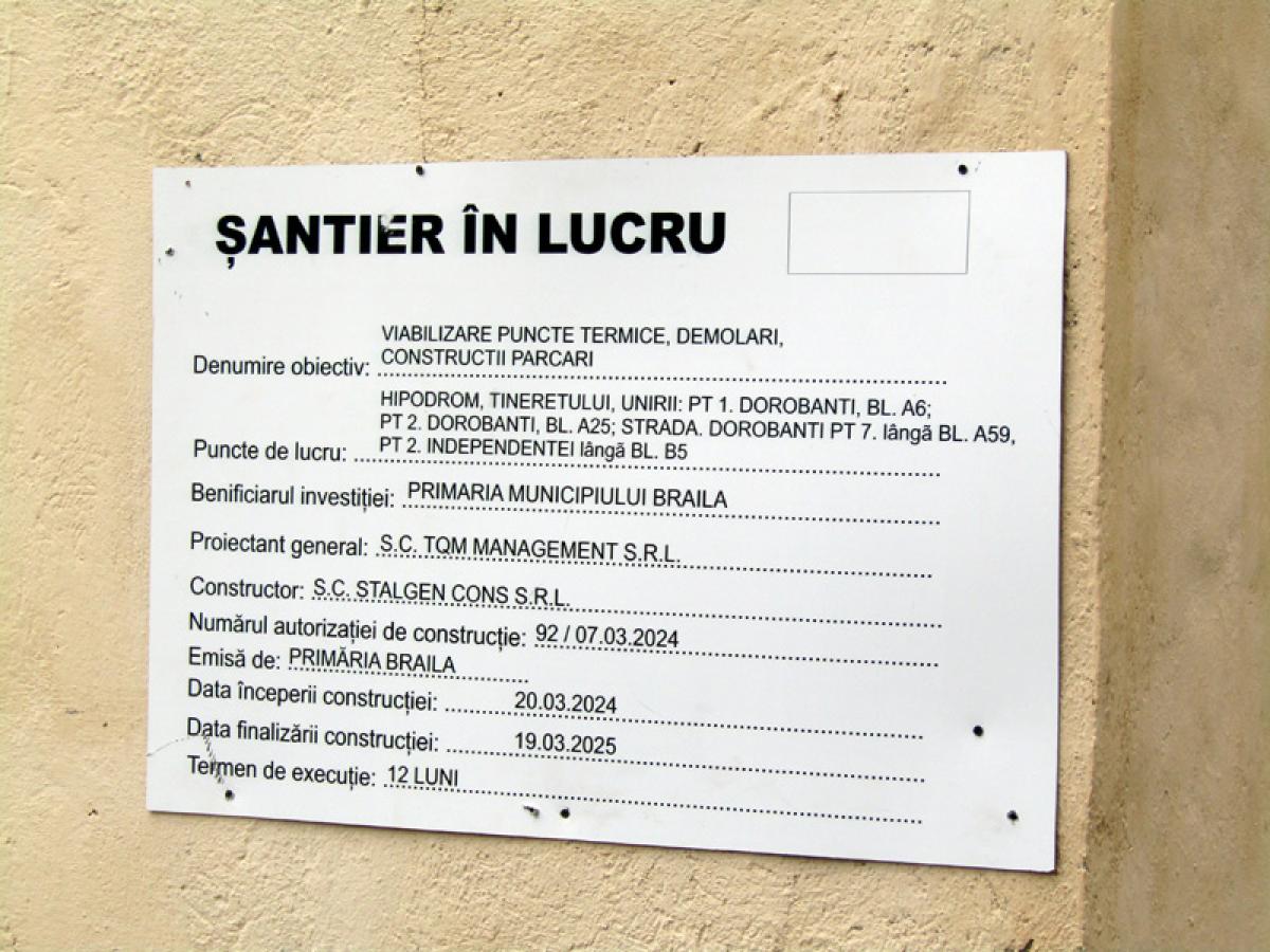 Amenajarea de parcări auto rămâne în continuare o problemă presantă la Brăila, motivată şi de lipsa spaţiilor unde acestea sunt necesare. Iar o modalitate găsită de Primărie pentru înfiinţarea de noi parcări, este şi “viabilizarea unor puncte termice prin demolarea acestora”, după cum scrie pe plăcuţa indicatoare a unui şantier recent deschis pe strada Hipodrom. Tot acolo sunt precizate punctele termice care vor deveni locuri de parcare. Acestea sunt amplasate în Hipodrom, Tineretului, Unirii, fiind vorba despre PT1 Dorobanţi, bl. A6; PT2 Dorobanţi, bl. A25; str. Dorobanţi PT 7, lângă bl.A6; PT 2 Independenţei, lângă bl. B5. Lucrările au început pe 20 martie a.c, iar termenul de finalizare a întregului proiect este 19 martie 2025.