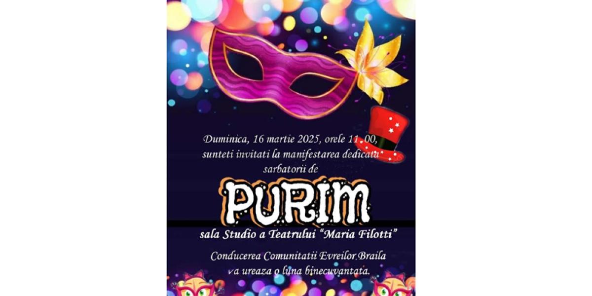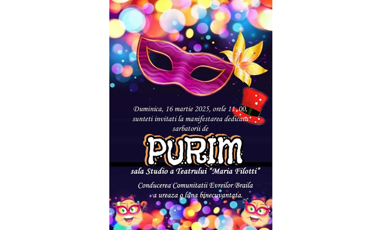 Comunitatea Evreilor Brăila - una dintre cele mai vechi comunități israelite din România - îi invită pe brăilenii de toate vârstele duminică, 16 martie, de la ora 11.00, în Sala Studio a Teatrului „Maria Filotti”, din Centrul Istoric al Municipiului Brăila, pentru a participa la sărbătoarea PURIM.