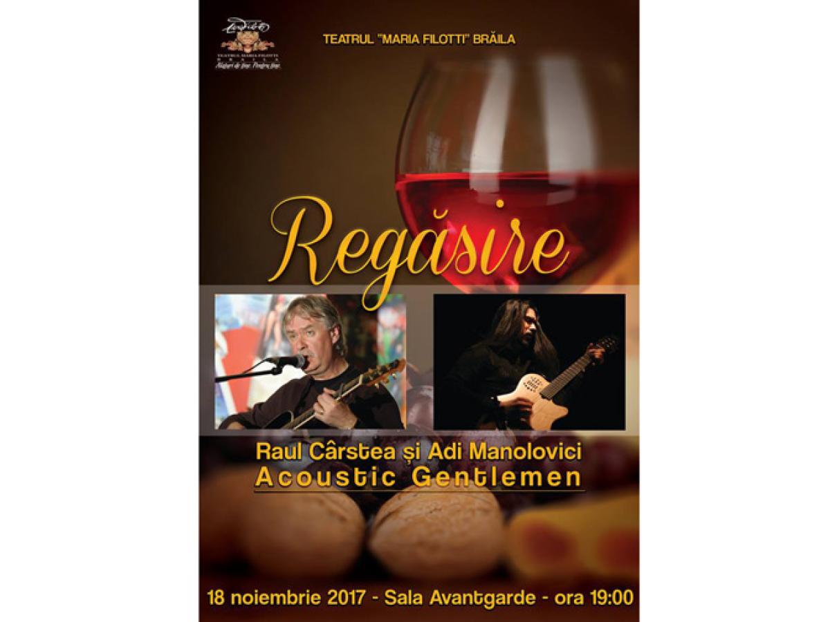 Sâmbătă, 18 noiembrie, de la ora 19.00, la Sala Avantgarde, sunteţi invitaţi să revedeţi “doi prieteni, două chitări, două suflete şi un singur mesaj” – Raul Cârstea şi Adi Manolovici- ACOUSTIC GENTLEMEN în REGĂSIRE .