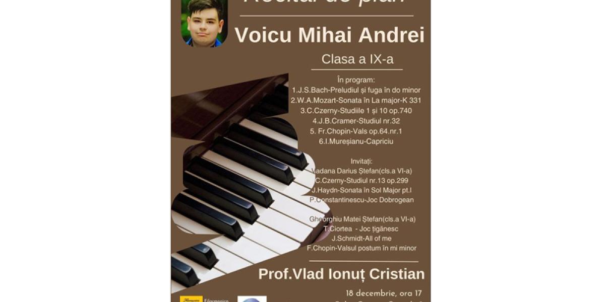 Născut într-o familie de distinși medici brăileni (tatăl său este conf. univ. dr. Dragoș Voicu, cunoscutul chirurg de la Spitalul Clinic Județean de Urgență Brăila, șef Secție Chirurgie), Mihai Andrei Voicu, în vârstă de 16 ani, elev în clasa a IX-a - muzică la Liceul de Arte „Hariclea Darclee” (prof. îndrumător Ionuț Cristian Vlad) va susține un Recital de pian miercuri, 18 decembrie, începând cu ora 17:00, la Sala „George Cavadia” a Filarmonicii „Lyra - George Cavadia” Brăila (Strada Ana Aslan nr. 29).