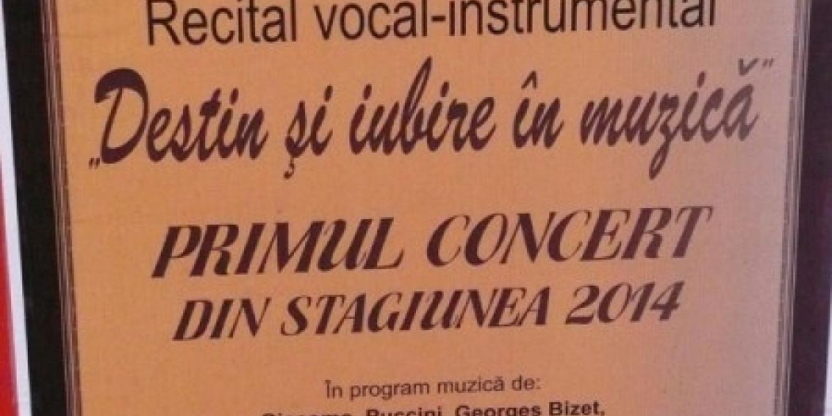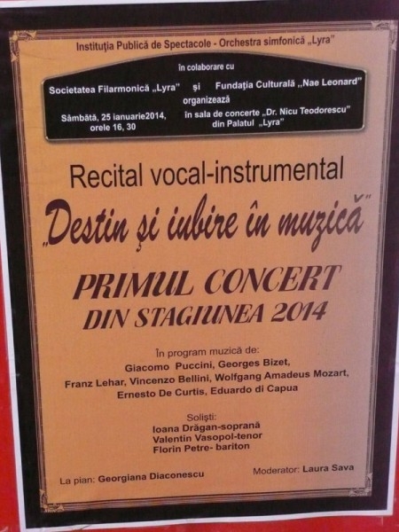 Astăzi, de la ora 16.30, în sala de Concerte "Dr. Nicu Teodorescu", din Platul Lyra, are loc recitalul vocal-instrumental "Destin şi iubire în muzică". Vor interpreta soliştii Ioana Drăgan - soprană, Valentin Vasopol - tenor, Florin Petre - bariton, acompaniaţi la pian de Georgiana Diaconescu. Moderator este Laura Sava.