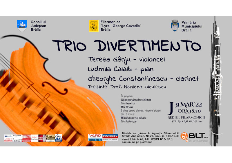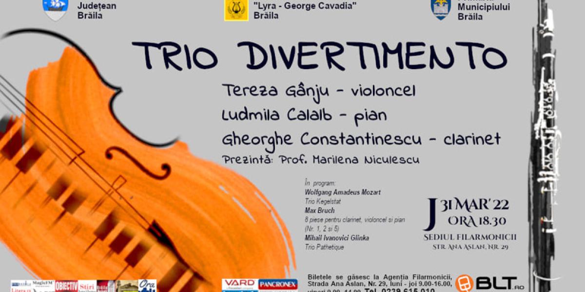 Trio Divertimento, un concept ce s-a născut în anul 2020 prin coagularea forțelor expresive ale celor trei muzicieni ce compun această formație camerală: Tereza Gânju - violoncel, Ludmila Calalb - pian și Gheorghe Constantinescu - clarinet. Îi veți putea asculta joi, 31 martie 2022, de la ora 18.30, la sediul Filarmonicii din Strada Ana Aslan, nr. 29, într-un recital cameral de excepție organizat de Filarmonica "Lyra-George Cavadia" Brăila, cu sprijinul Consiliului Județean Brăila și al Primăriei Municipiului Brăila.