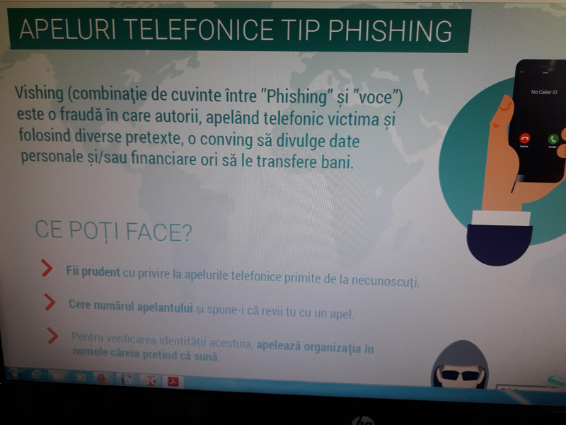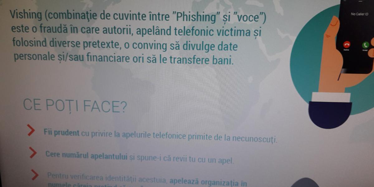 Apelurile telefonice tip phishing se referă la situaţiile în care autorii contactează victima telefonic şi, invocând diferite pretexte, o conving să le divulge date personale sau financiare ori să le transfere bani. Vă puteţi feri de fraudele prin această metodă. În primul rând, trebuie să fiţi prudenţi cu privire la apelurile telefonice primite de la necunoscuţi. Este bine să cereţi numărul apelantului şi spuneţi-i că veţi reveni dumneavoastră cu un apel. Pentru a verifica identitatea apelantului, sunaţi la firma/compania în numele căreia spune că sună.