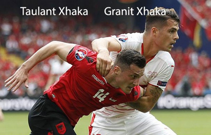 Partida Elveţia-Albania, disputată sâmbătă, a marcat primul duel fratricid de la un campionat de fotbal european. Mijlocaşul elveţian Granit Xhaka (23 de ani) a primit replica fratelui mai mare, Taulant Xhaka (25 de ani). Ambii s-au născut la Basel, Elveţia, unde familia lor se mutase din Kosovo. La îndemnul fratelui mai mic, Taulant a acceptat să joace în reprezentativa Albaniei, după ce a primit cetăţenia albaneză (2013). În partida de sâmbătă, Taulant a fost înlocuit în minutul 62, fapt care l-a înfuriat, trântind o sticlă cu apă după ce a ieşit de pe teren. Granit a fost integralist.