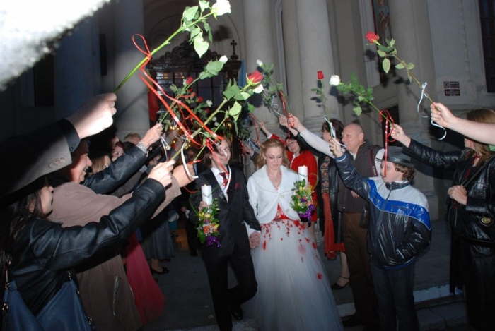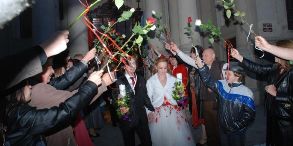 Cu rochia de un alb imaculat presărat cu motive florale roşii, mireasa nu avea cum să nu atragă priviri pline de admiraţie, iar mirele a ţinut pasul cu o ţinută impecabilă şi atitudine curajoasă.