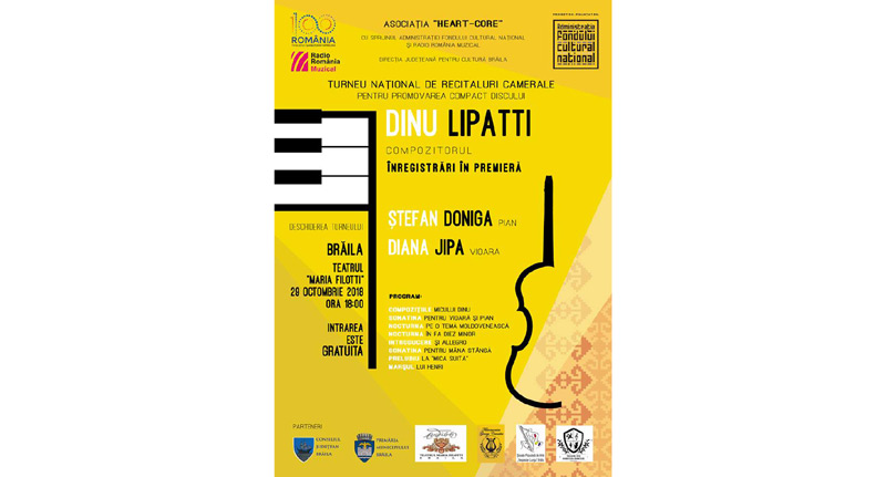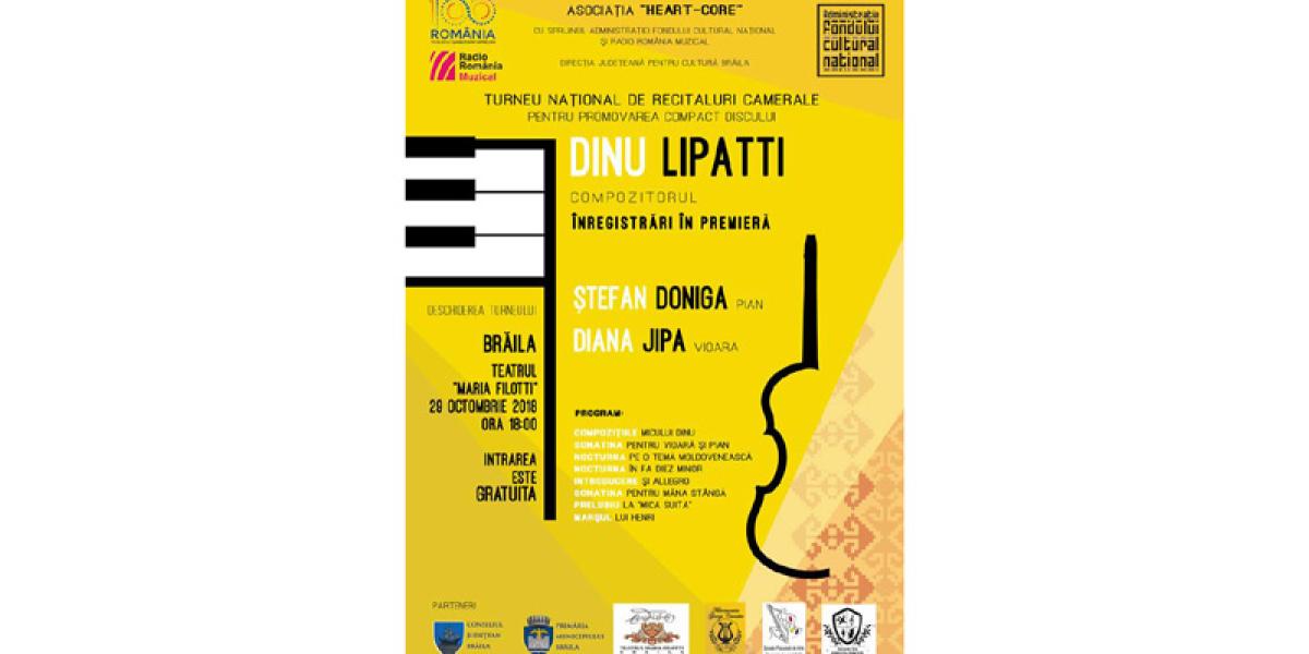 Luni, 29 octombrie 2018, începând cu orele 18.00, în Sala Mare a Teatrului „Maria Filotti” va avea loc Recitalul pentru promovarea compact discului „DINU LIPATTI – compozitorul. Înregistrări în premieră”. Spectacolul de la Brăila va deschide Turneul naţional de promovare, în doar şase oraşe din ţară, a celui mai nou produs discografic dedicat creaţiei şi personalităţii ilustrului muzician român.