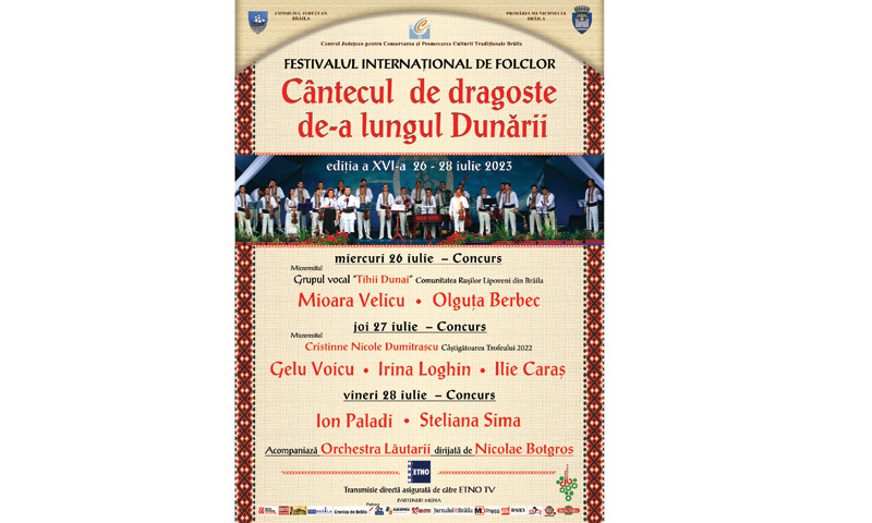 „Atât portul tradițional cât și muzica populară fac parte din identitatea românilor, iar pentru a scoate mai mult în evidență importanța folclorului autentic, timp de trei zile, 26, 27 și 28 iulie 2023, la Brăila, va avea loc cea de-a XVI-a ediție a Festivalului Internațional de Folclor „Cântecul de dragoste de-a lungul Dunării”, organizat de Consiliul Județean Brăila, prin Centrul Județean pentru Conservarea și Promovarea Culturii Tradiționale și Primăria Municipiului Brăila, pe scena de la Esplanada Dunării - o incursiune în folclorul autentic național și internațional, un regal folcloric cu ansambluri, concurenți și artiști de renume din țară și din străinătate”, precizează, într-un comunicat, organizatorii evenimentului.